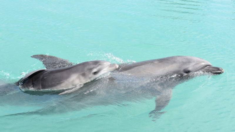 産まれたばかりのイルカの赤ちゃんは、まだ上手に泳ぐことができません。いつもお母さんイルカが一緒にいて、溺れないように呼吸を助けます。イルカが呼吸に使う鼻の穴は、頭のてっぺんに付いています。赤ちゃんが楽に呼吸できるように、お母さんが赤ちゃんの下に潜り込み、頭を押し上げているのです。