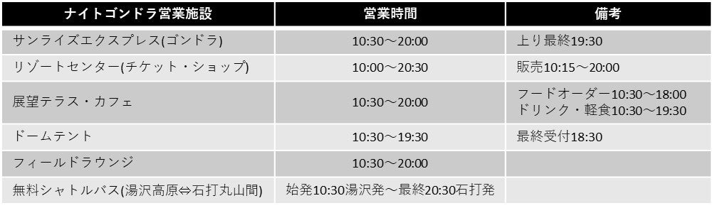 ※ナイトゴンドラ期間中は始発10:30湯沢発~最終20:30石打発まで運行