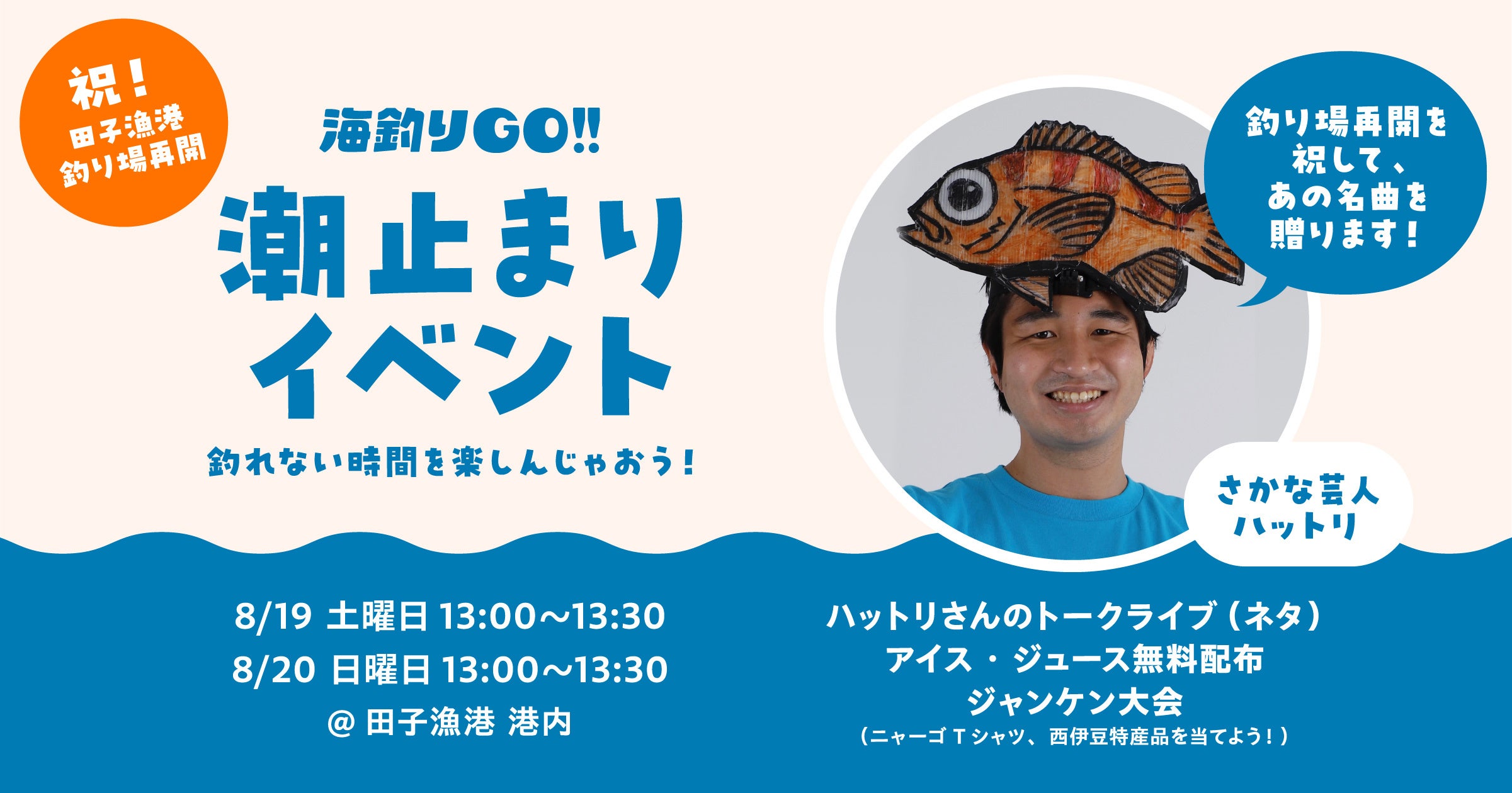 8/19、8/20の2日間については、田子漁港での海釣り再開を祝し、港内にて「海釣りGO潮止まりイベント」を開催。釣れない時間を楽しんじゃおう!