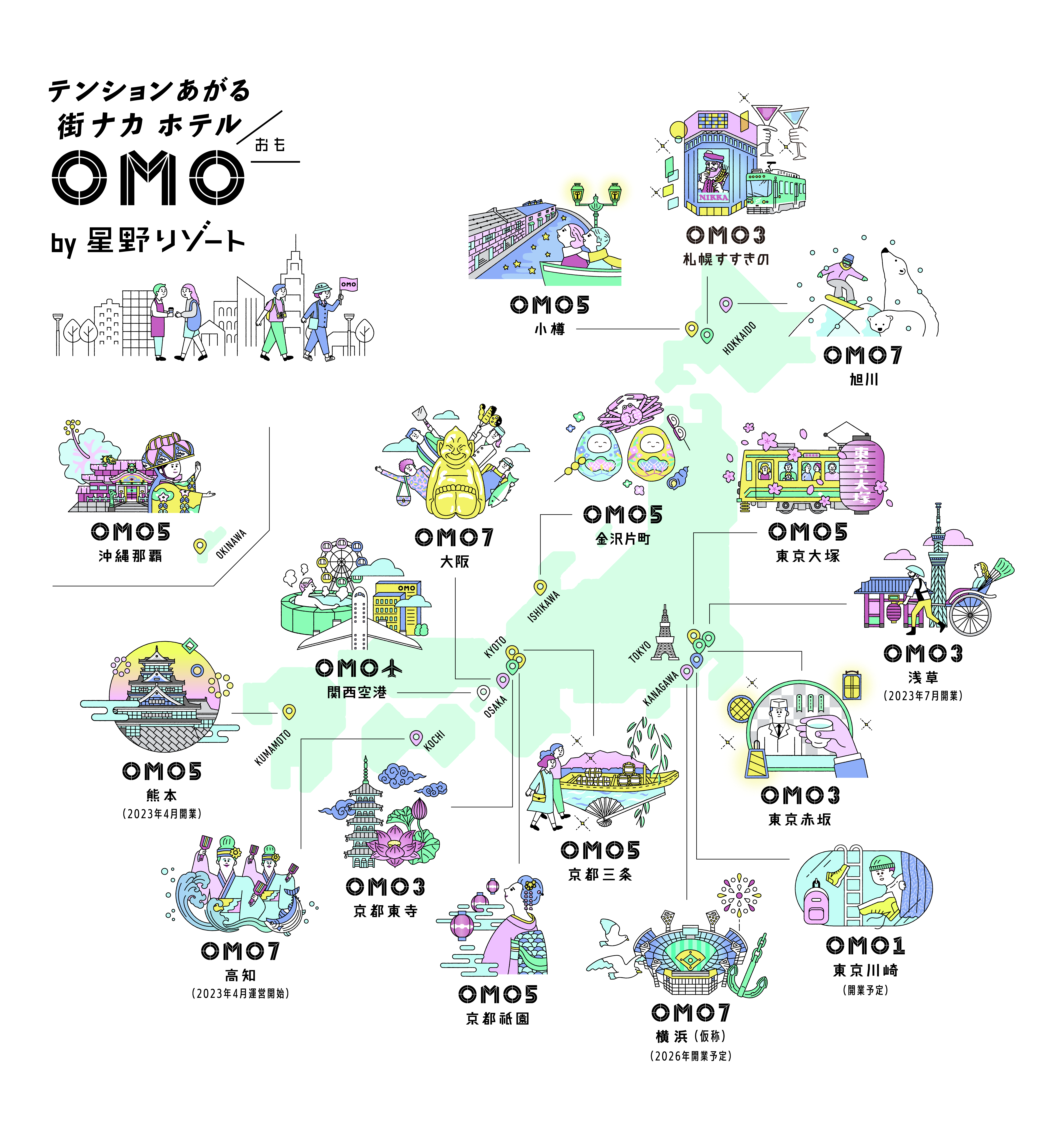 「OMO」は星野リゾートが全国に展開する「テンションあがる『街ナカ』ホテル」。街をこよなく愛するスタッフが地域の方々と仕掛ける、新感覚のホテル。思いもよらない魅力に出会い、知らず知らずのうちにその街までお気に入りに。現在、15施設展開中。2023年7月31日には「OMO3浅草」が誕生しました。