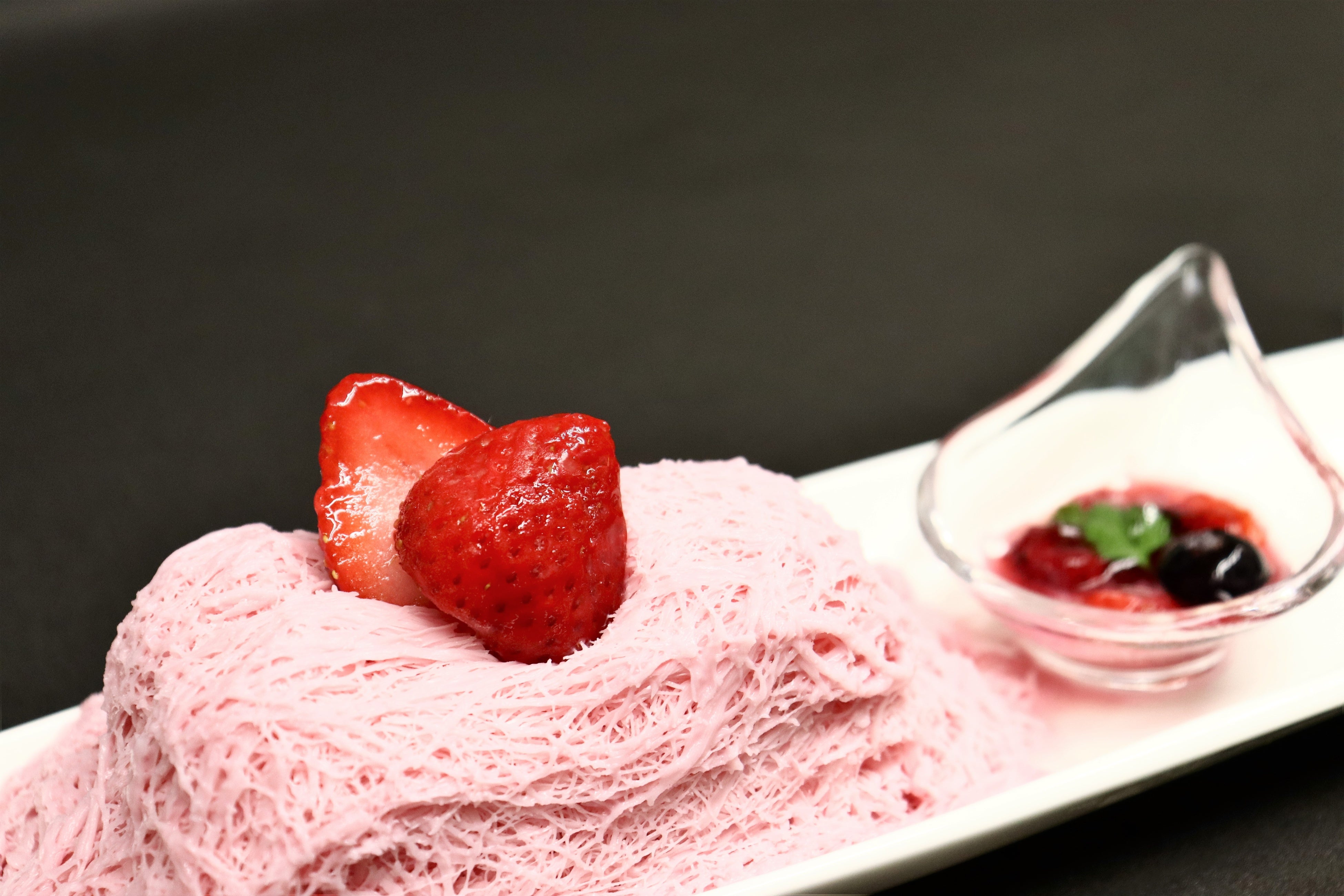 今夏ご提供する「糸ピンス」は、特殊な機械によって糸状の氷が重なって出来上がるのが特徴で、美しい糸状のピンスはナイフとフォークで切り分けてお召し上がりいただく韓国スタイルを採用。フワっと柔らかい口当たりがクセになり、たった一口でやみつきになる程の美味しさ。