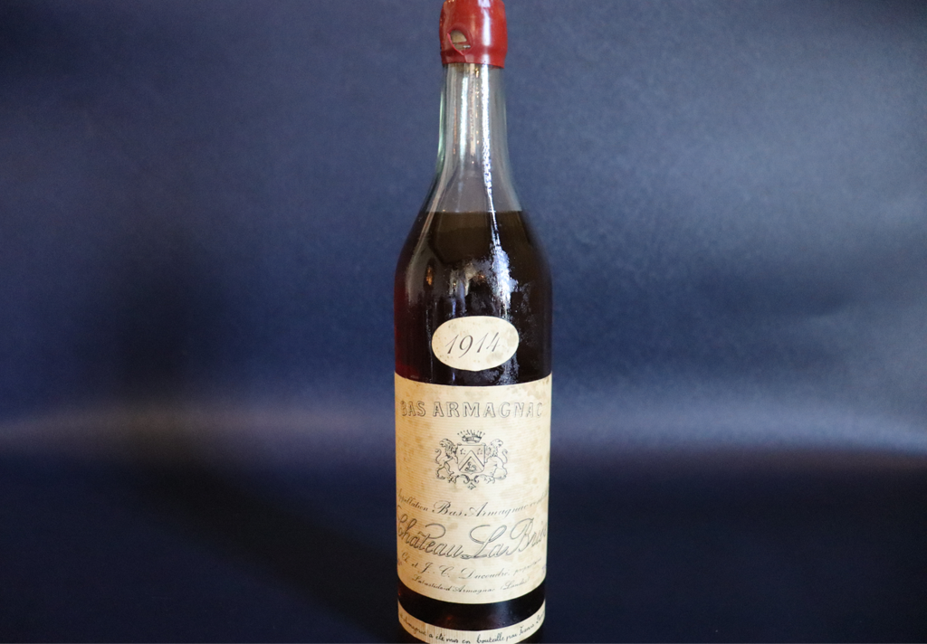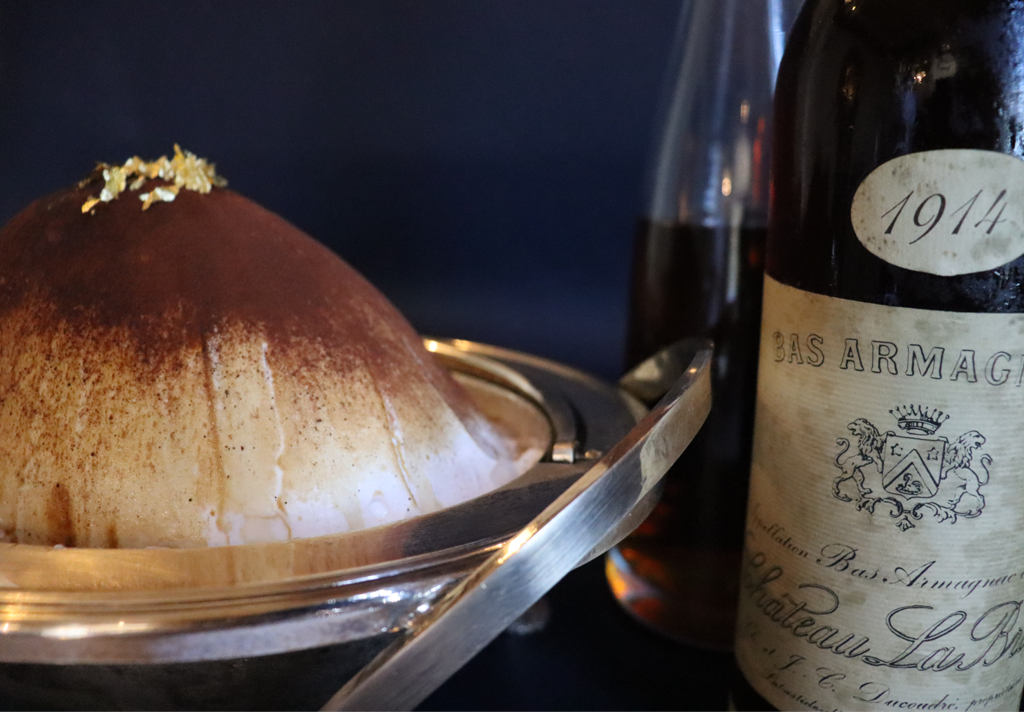 「アルマニャック焼き氷 1914Ver.」で使用するのは、アルマニャックの中でも芳醇な香りが特徴的な味わい深いブランデー「Chateau La Brise」1914年。第一次世界大戦が始まった激動の時代に製造された希少なX.Oアルマニャックだからこそ表現できるキレと深みのある世界をお楽しみください。