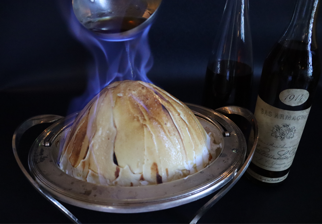 ■ 芸術的なフランベパフォーマンスは必見。五感で楽しむスイーツ「アルマニャック焼き氷 1914Ver.」。