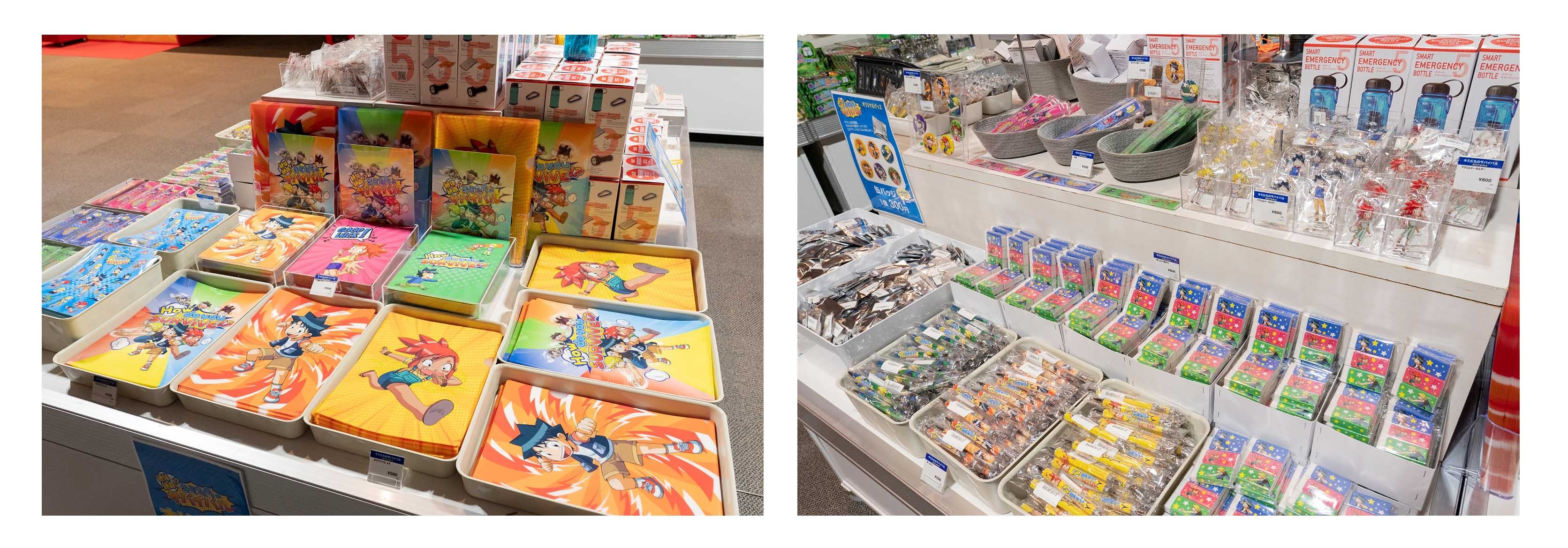 イベント限定のかわいいオリジナルグッズも多数ご用意しています。防犯ブザーやエマージェンシーボトルなどサバイバルにちなんだグッズもあります。