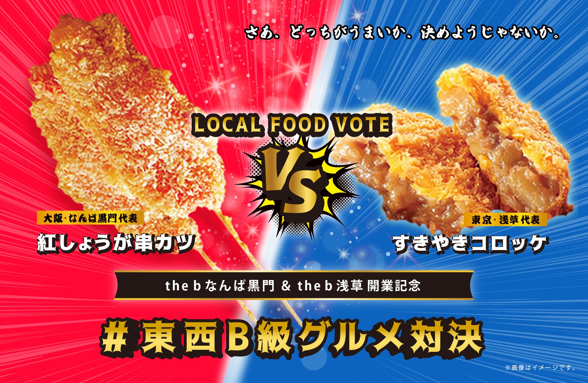 Twitterでは「こっちの方が食うてみたいな!」と思う方に投票するキャンペーンをやっとります。題して東西B級グルメ対決フォロー&リツイートキャンペーンですわ。投票してくれはったら、the b なんば黒門かthe b 浅草に泊まれる無料宿泊券(抽選で2組4名様)か、the b hotelsオリジナル方言ステッカー(抽選で10名様)をプレゼントさせてもらいまっせ。ぜひ楽しんでみてや!