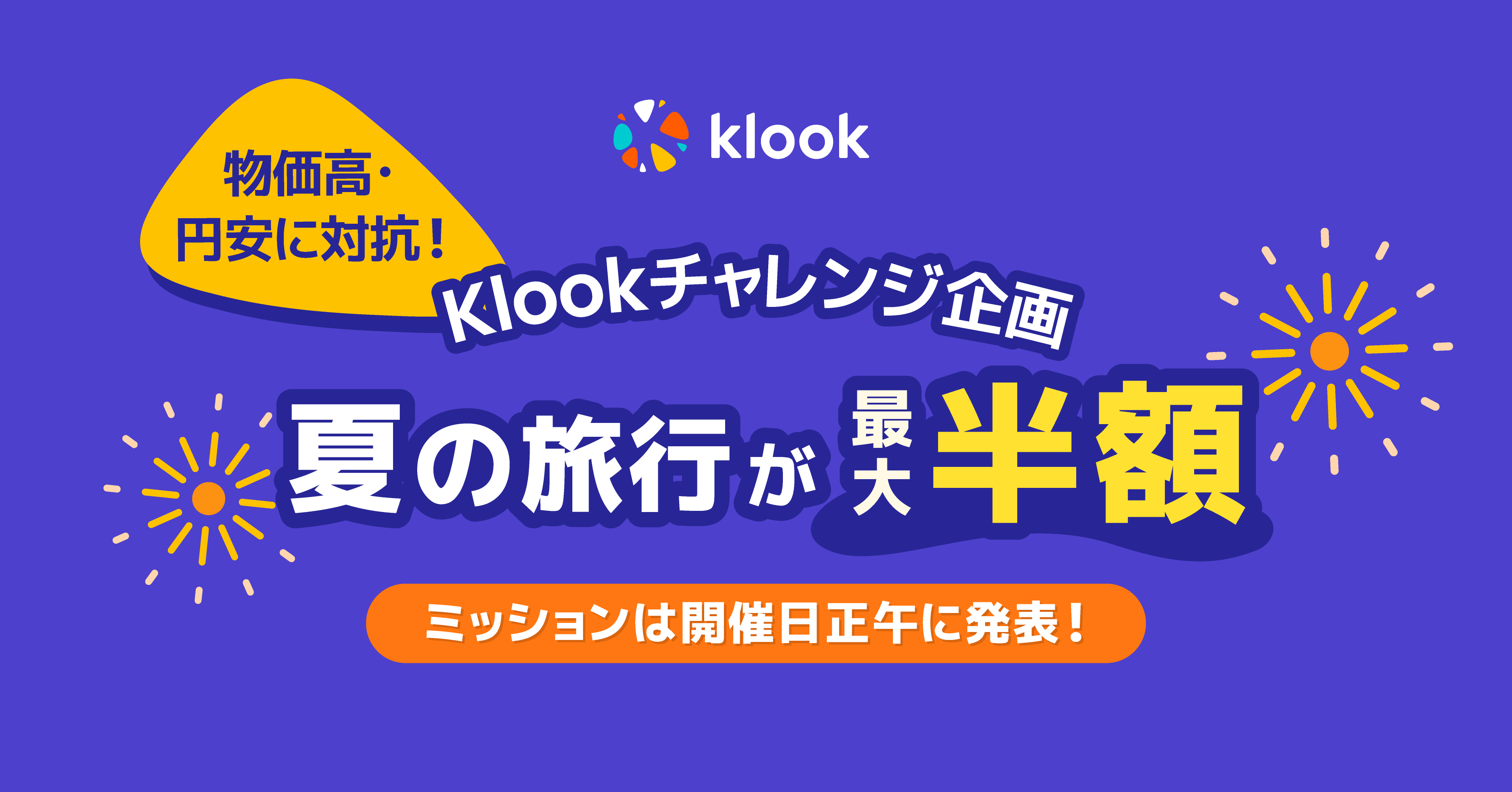 世界をリードする旅行・レジャー予約サイトKlookは、物価高・円安による値上げラッシュの今夏を乗り切る企画として、指定時間内に指定人数が集まるとKlookの商品が最大半額となるクーポンを参加者全員に配布する「Klookチャレンジ」を8月9日から8回開催します。Klookはこの夏もお得を追求し、ユーザーの皆さまの夏の楽しい思い出作りを応援いたします。
