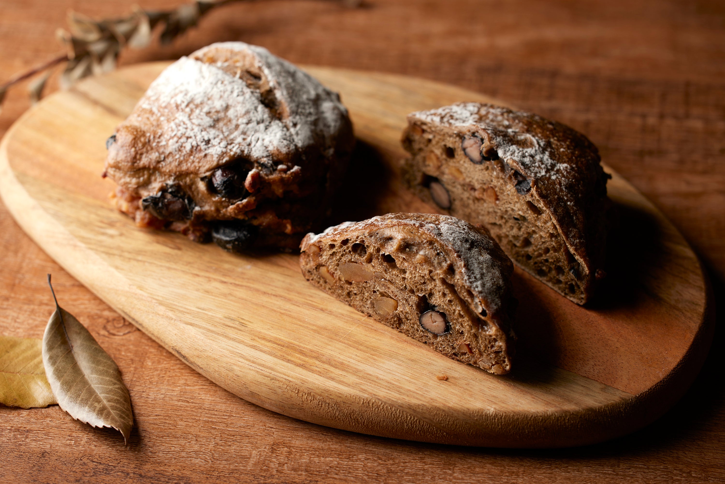 Bakery & Pastry Shopにて人気のレギュラーメニューであるバゲット「熟-JYUKU-」の生地にほうじ茶パウダーを混ぜ込み、マロングラッセ、丹波の黒豆、クルミを散らして焼き上げ、秋仕様に仕立てました。