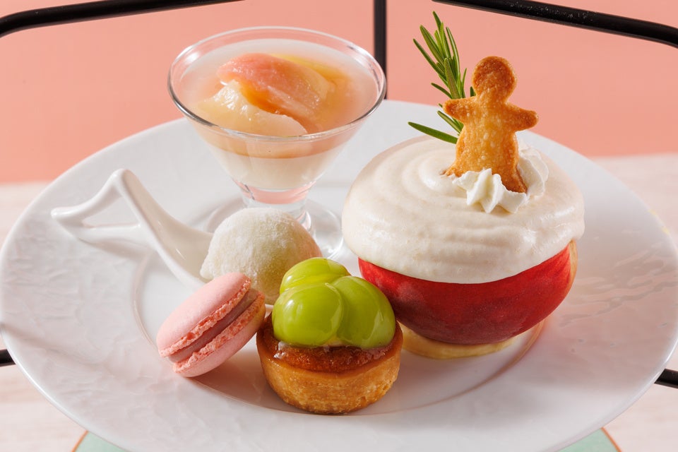 フルーツの美味しさをそのまま生かしたスイーツには、甘くてジューシーな桃をまるごと1玉使用し、半分を使ってムースを作り、残り半分は器として果肉の上にムースを絞った、物語「桃太郎」イメージの“まるごとピーチムース”や、口当たりの良いパンナコッタの上に、桃の甘さと香り、柔らかい果肉の食感が楽しめる“ピーチジュレのパンナコッタ”。アーモンドクリームにマスカットの香りが漂う茶葉を混ぜ込み焼き上げたタルトにシャインマスカットをトッピングした“シャインマスカットのタルト”、シャインマスカットを一粒まるごと包んだ“シャインマスカット大福”などをご用意しました。