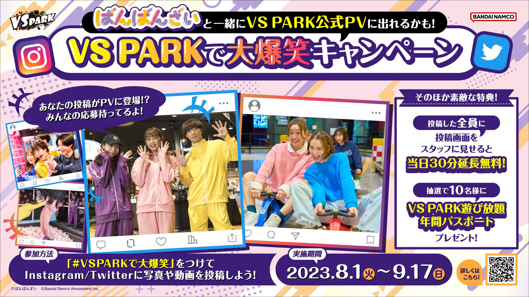 株式会社バンダイナムコアミューズメントが運営する新感覚バラエティスポーツ施設『VS PARK』では、2023年8月1日(火)から9月17日(日)までの期間、VS PARKで友だちや家族と楽しんで大爆笑している写真や動画をSNS※1に投稿すると、大人気3人組YouTuber「ばんばんざい」が出演するVS PARK公式プロモーションビデオの一部に参加できるチャンス※2がもらえる「#VSPARKで大爆笑」キャンペーンを実施します。