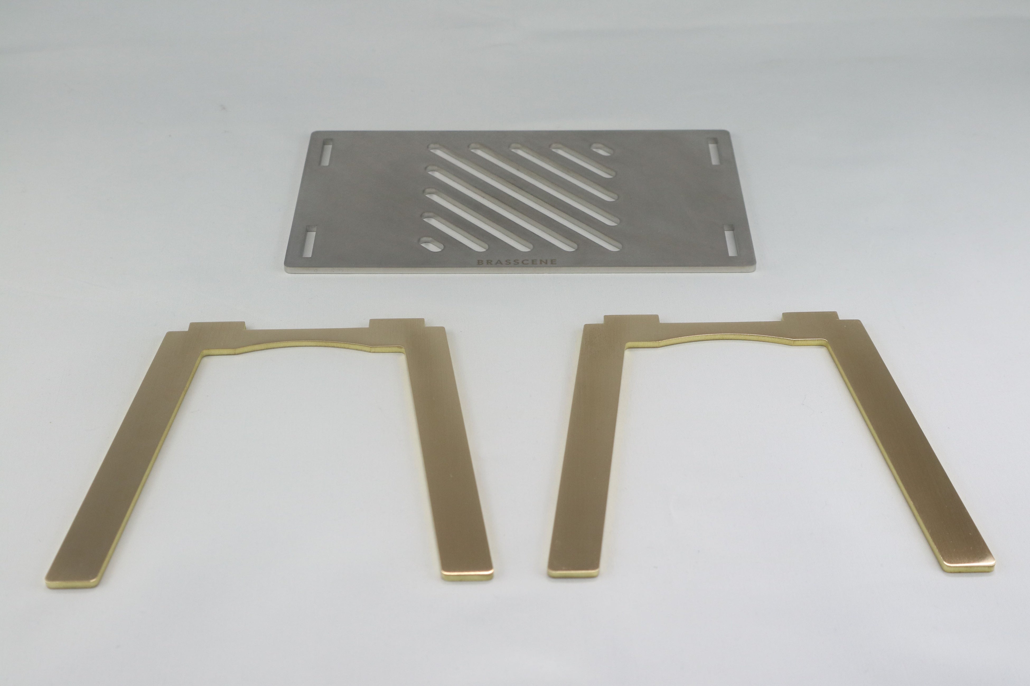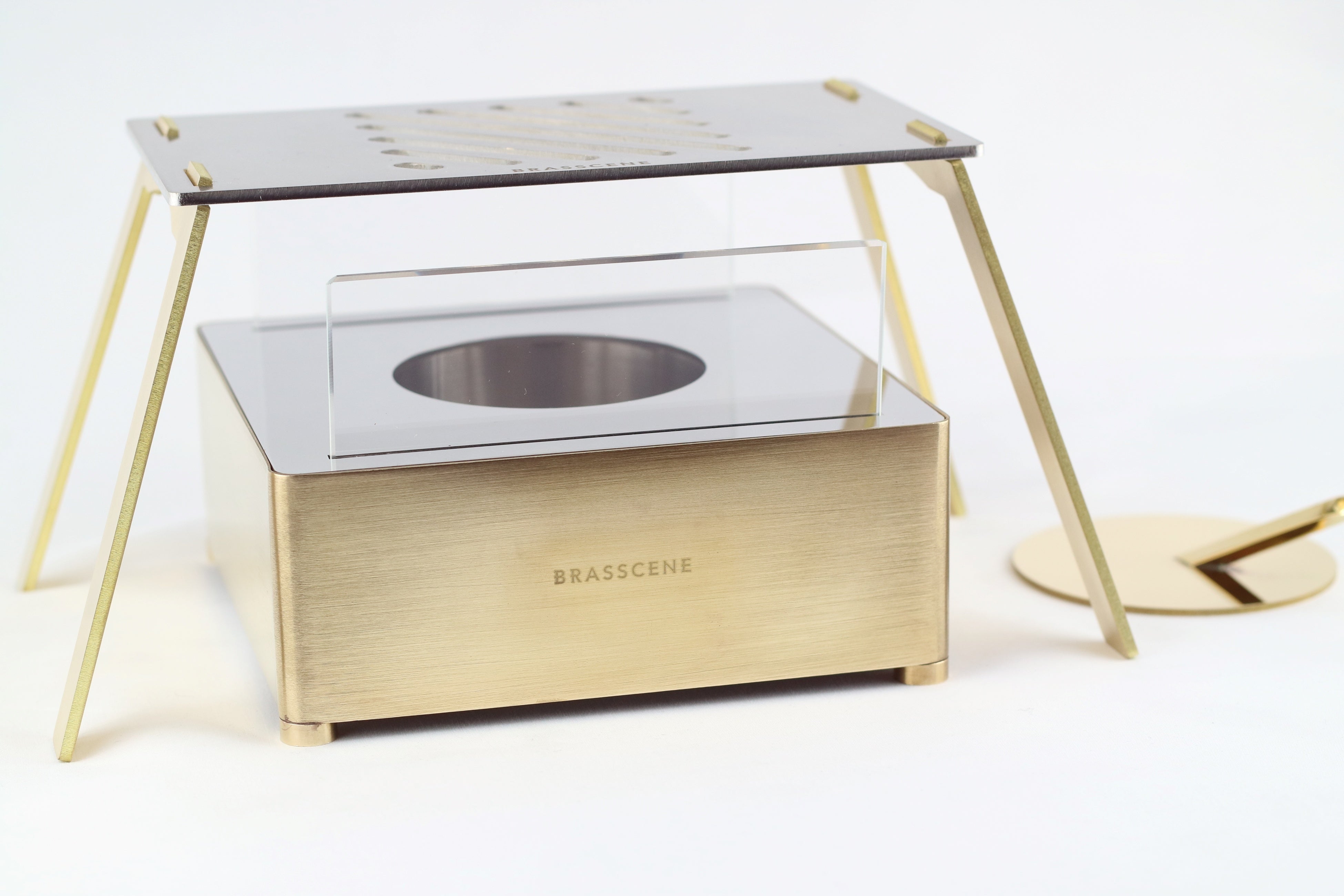 天板には、耐熱性に優れた3㎜厚のステンレスを採用しております。また脚部の真鍮も同様に3㎜厚の板材を使用しているため、コンパクトでありながら10㎏までの耐重性があります。