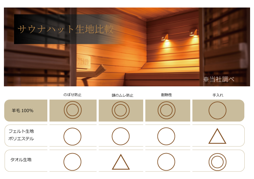 一般的に羊毛100%の生地は通気性が良く、汗を吸収しやすいため、サウナハットの使用に適していると言われます。また羊毛の天然の油分が含まれているため、湿気を防ぐ効果があるとも言われています。またこの商品は国産の素材です。現在羊毛フェルトを生産している工場が、国内では少なく希少価値の高い素材とも言えます。