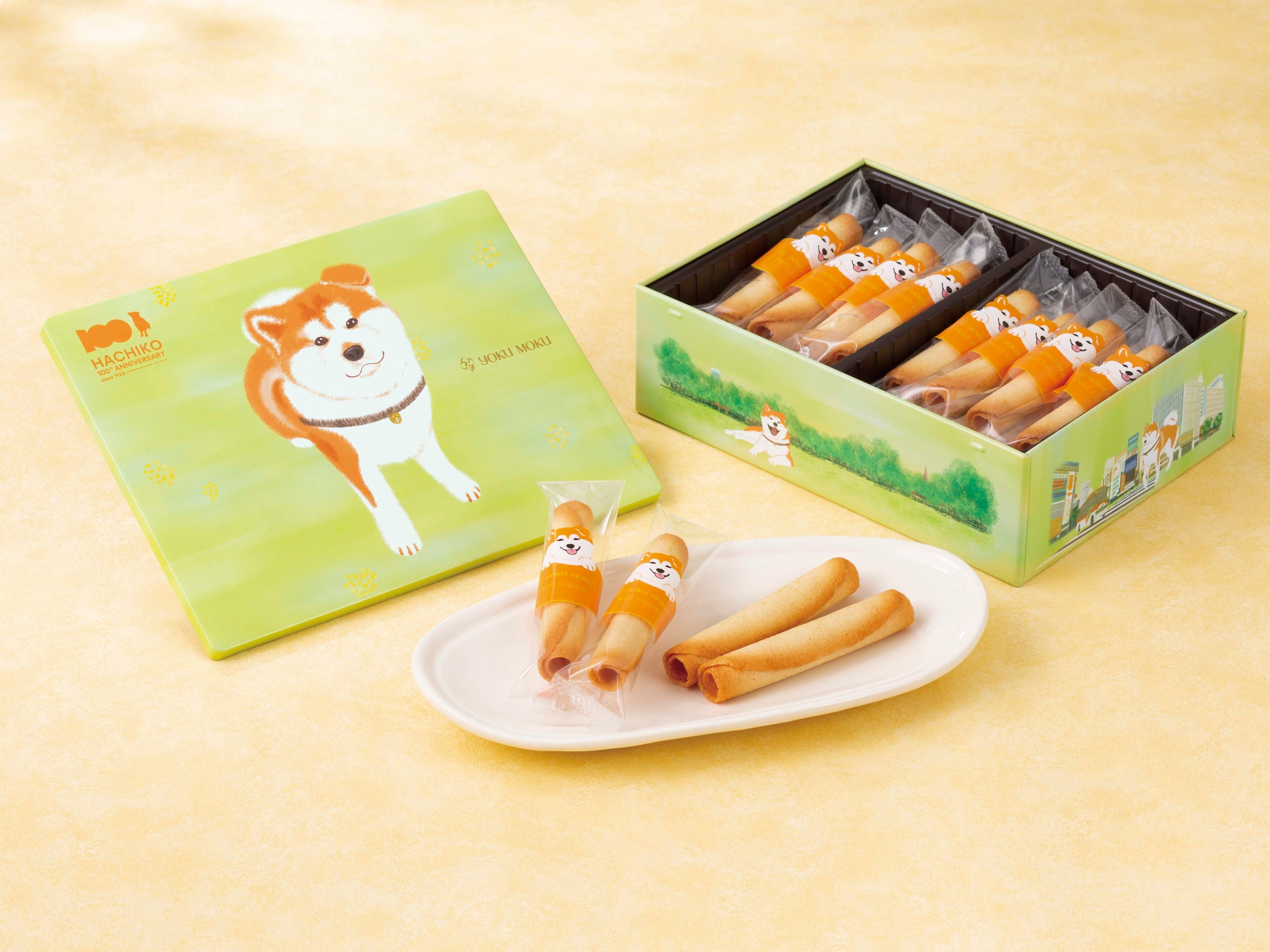 内容:ハチ公生誕100年を記念した、期間限定品を販売!お土産に思わず連れて帰りたくなるハチ公のイラストと、側面には渋谷の名所が!中には、バターをふんだんに使った生地を焼き上げロール状に巻いたクッキー『プティ シガール』を詰めました。バターのコクを生かした豊かな風味とサクサクとした軽い口当たり、そして繊細なくちどけをお楽しみ下さい!
