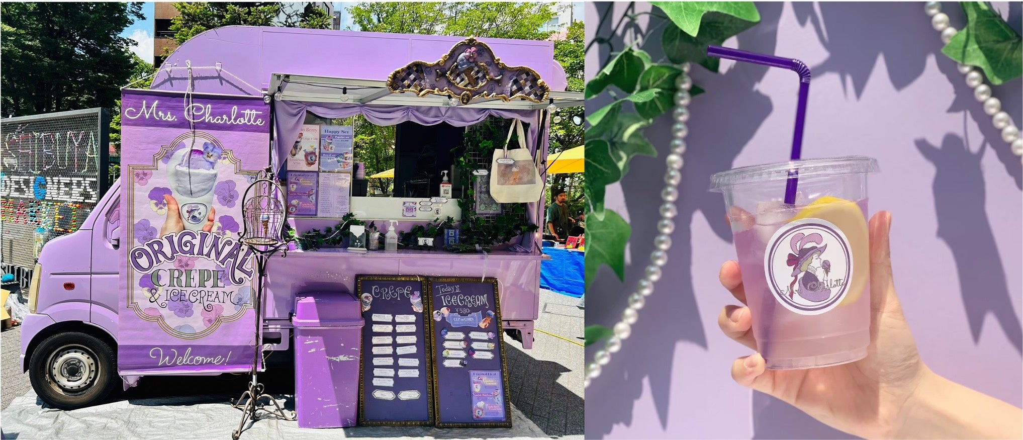 「日常に優雅で贅沢なひとときを」ラベンダー色のクレープやアイスクリームにエディブルフラワーを添えた華やかなスイーツと非日常の世界観で、皆様に素敵なひとときをご提供します!