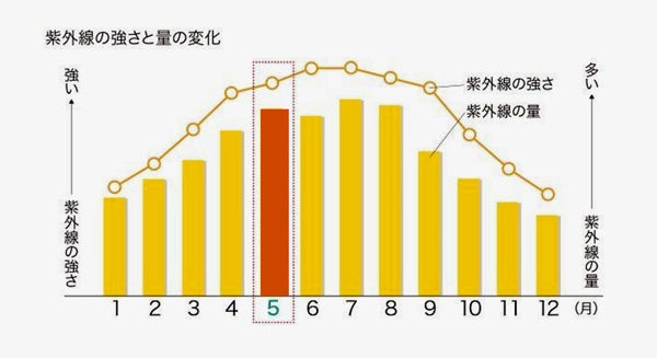 5月頃から8月半ばは、1年の間で紫外線の強い時期です。(※左図参照)紫外線を浴びた肌をケアせず放置していると、シミや黒ずみなどの原因である色素沈着や角質肥厚が起こります。