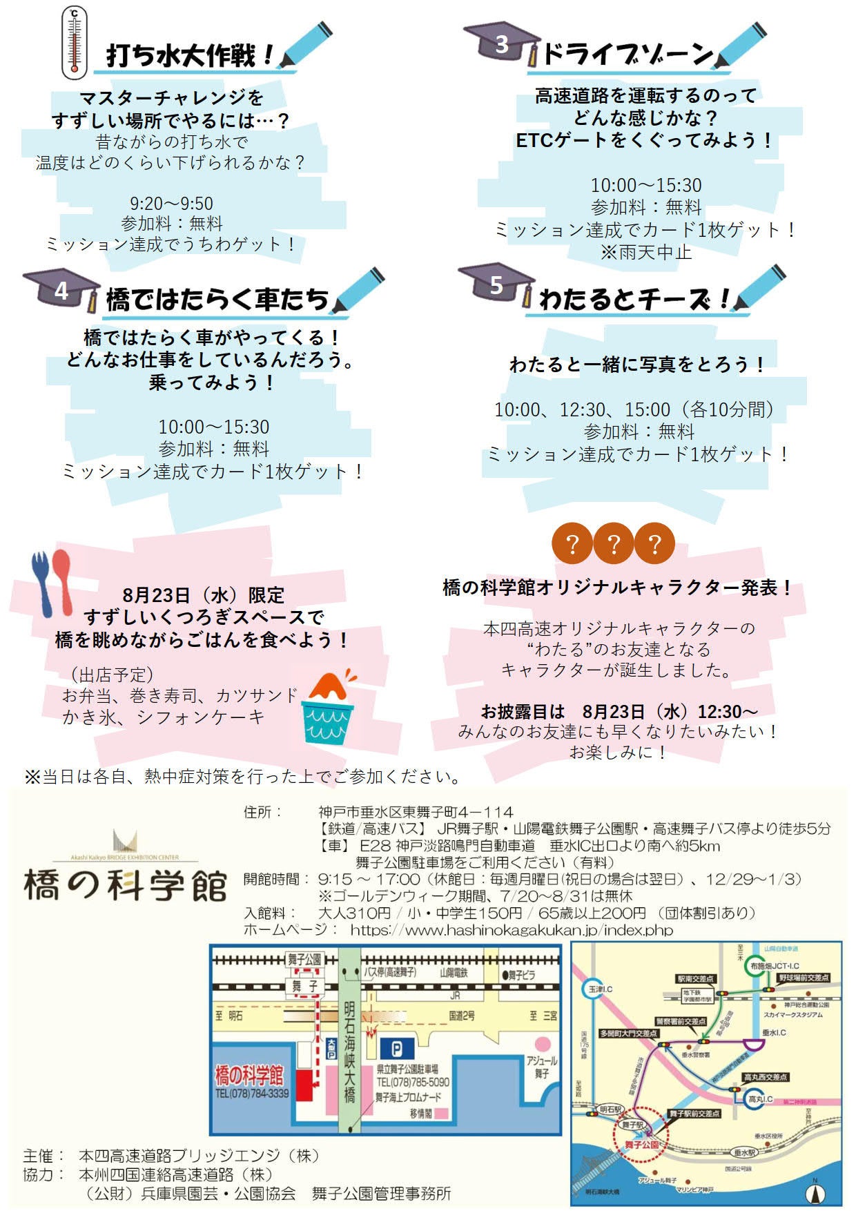 8月23日(水)は「橋マスターチャレンジデー!」として、「自由研究ワークショップ」と、実際に間近で橋を見て感じる「橋の学校」のスペシャルトレーニング(要事前申込・参加料1,000円/1組)を開催します。そのほか、高速道路パトロールカーへの乗車体験や、橋の科学館オリジナルキャラクターのお披露目など、事前申込なしで当日参加できるコンテンツも。ミッションをクリアしてカードを集めよう!この夏、君も橋マスターになる!