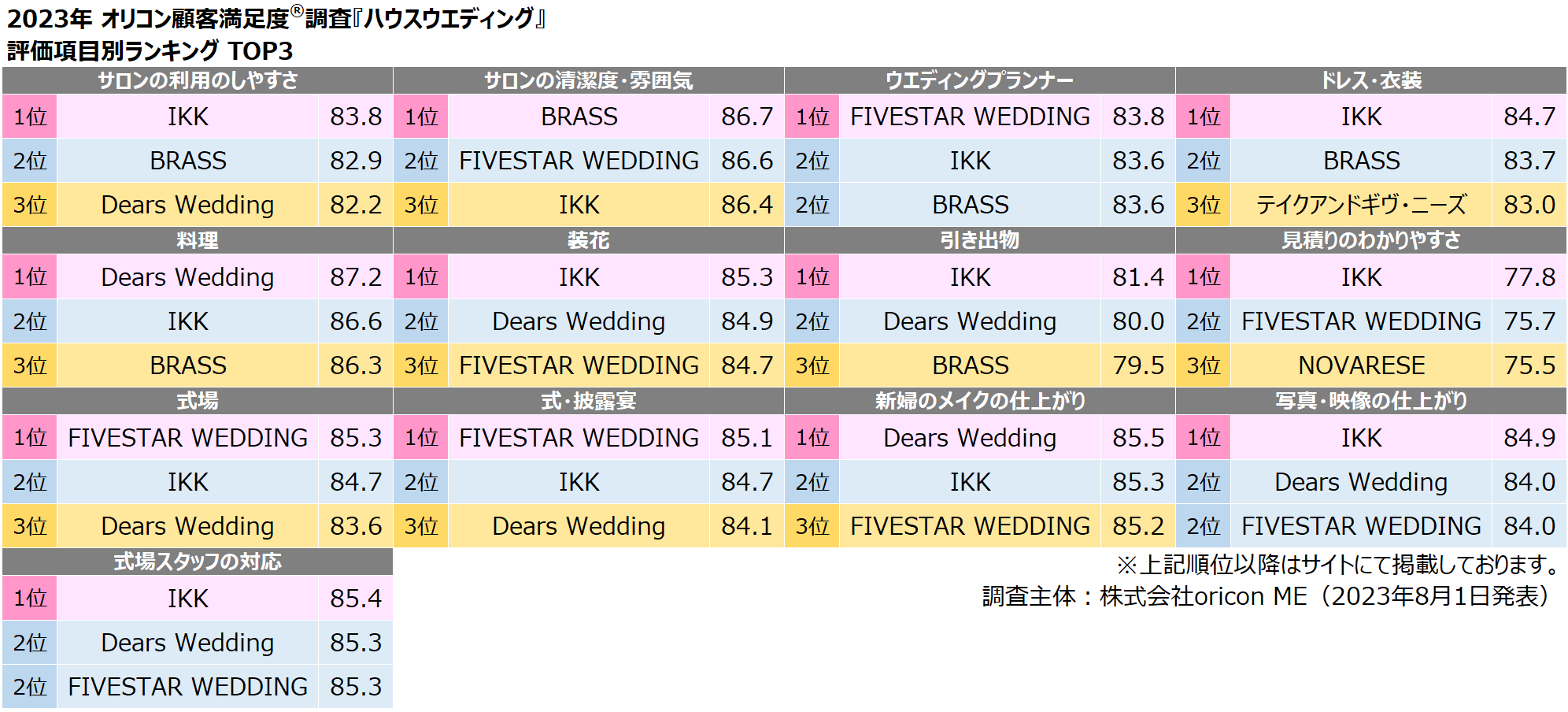 【IKK】が2年連続総合1位 「式場スタッフの対応」「ドレス・衣装」など7項目で1位に