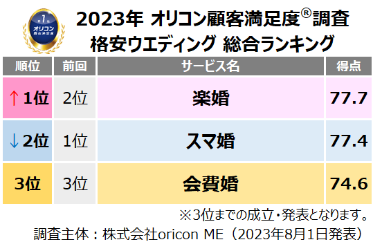 【楽婚】が5年ぶり3度目の総合1位 挙式や披露宴の演出などを評価した「式・披露宴」では3年連続1位