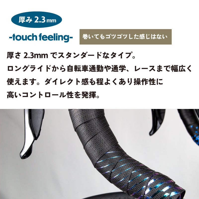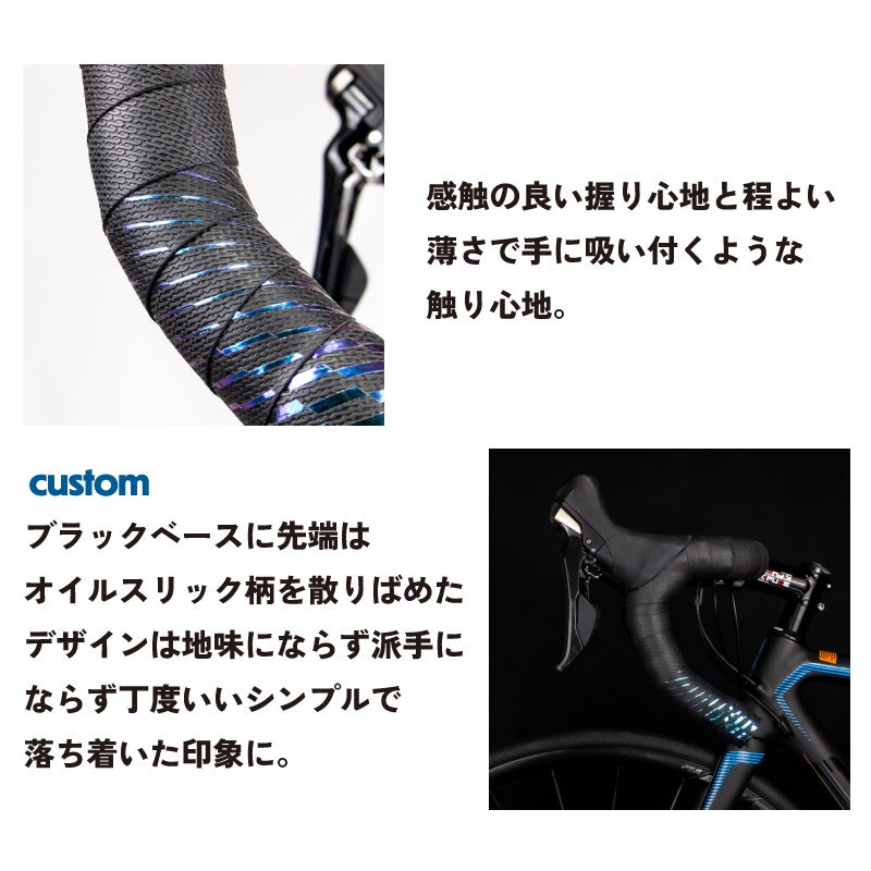 ブラックベースに先端はオイルスリック柄がちりばめられたおしゃれなバーテープです。