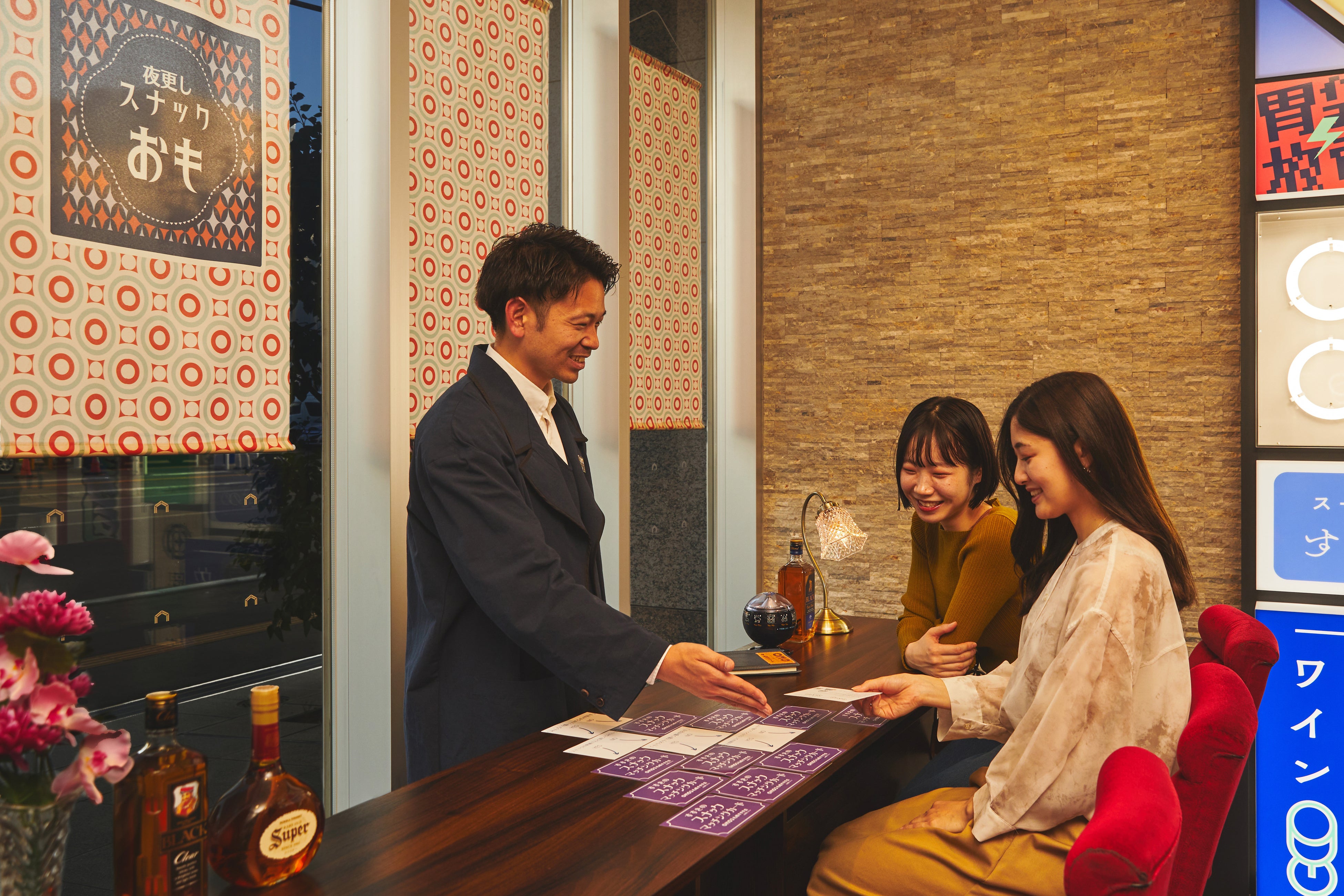 OMOレンジャーがスナックの楽しみ方を伝授する 「すすきのアペロミーティング ~スナック編~」を毎日開催します。すすきののスナックを知り尽くしたOMOレンジャーが、質問が書かれたカードを元にお客様とスナックをマッチングしていきます。こだわりのお酒と会話を楽しみたい、人生相談をしたい、気軽にふらっと立ち寄りたい、などのお客様の回答から、ぴったりのスナックを導きます。札幌に初めて来た人でも、行きつけになりうるスナックを見つけることが可能です。