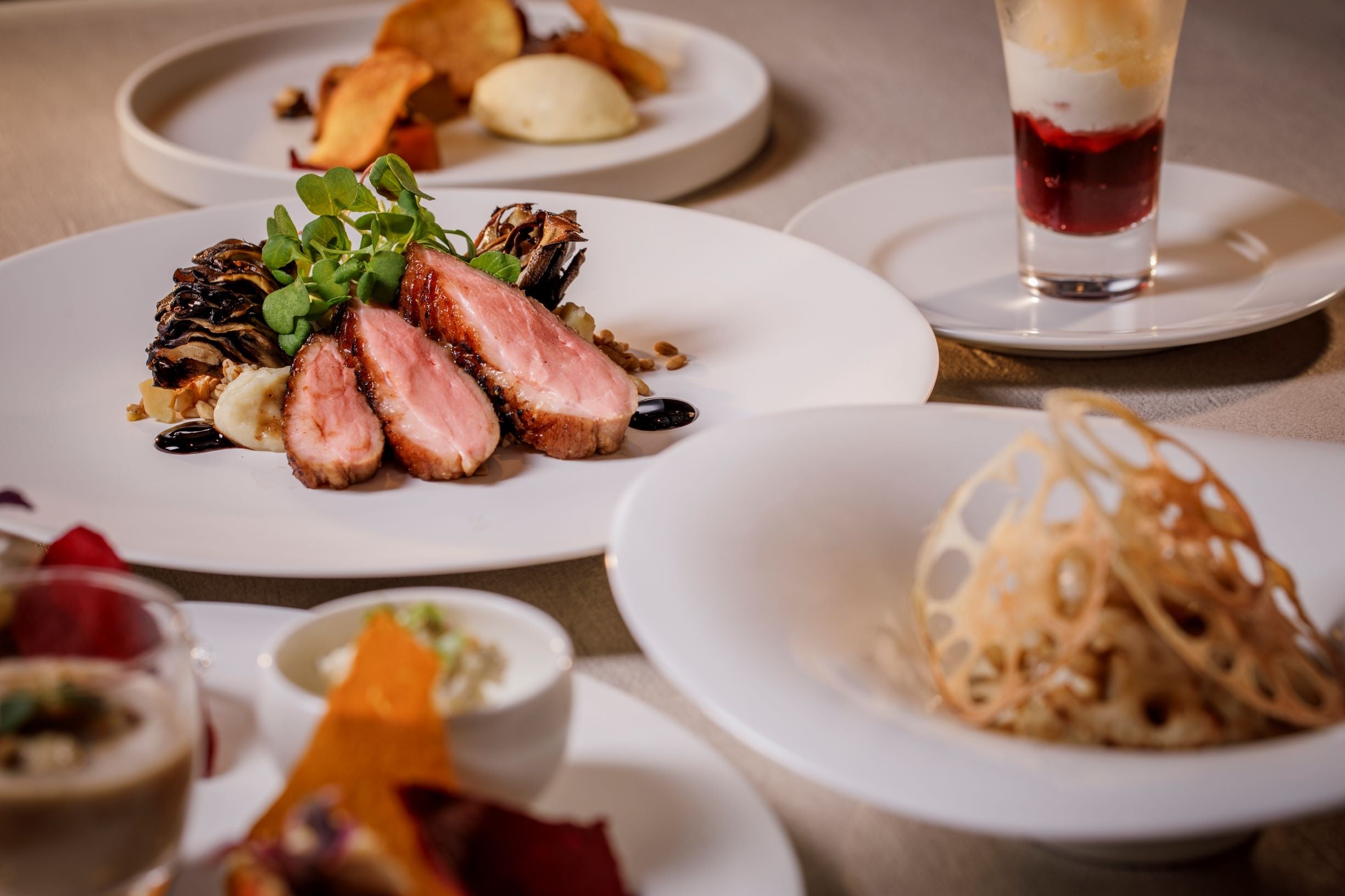 3品よりお選びいただけるメイン料理のうち、肉料理はしっかりとした歯ごたえを残しつつ、柔らかく上品な脂で臭みがないのが特長の茨城県産の常陸鴨を採用。スパイスとメープルシロップを塗ってこんがりと焼き上げた「ラケ」という“照り焼き”スタイルで仕上げました。記念日や大切な方とのフレンチを愉しむ時間は、ウェルネスでありギルトフリーな料理とともに過ごして欲しい。という願いが込められています。