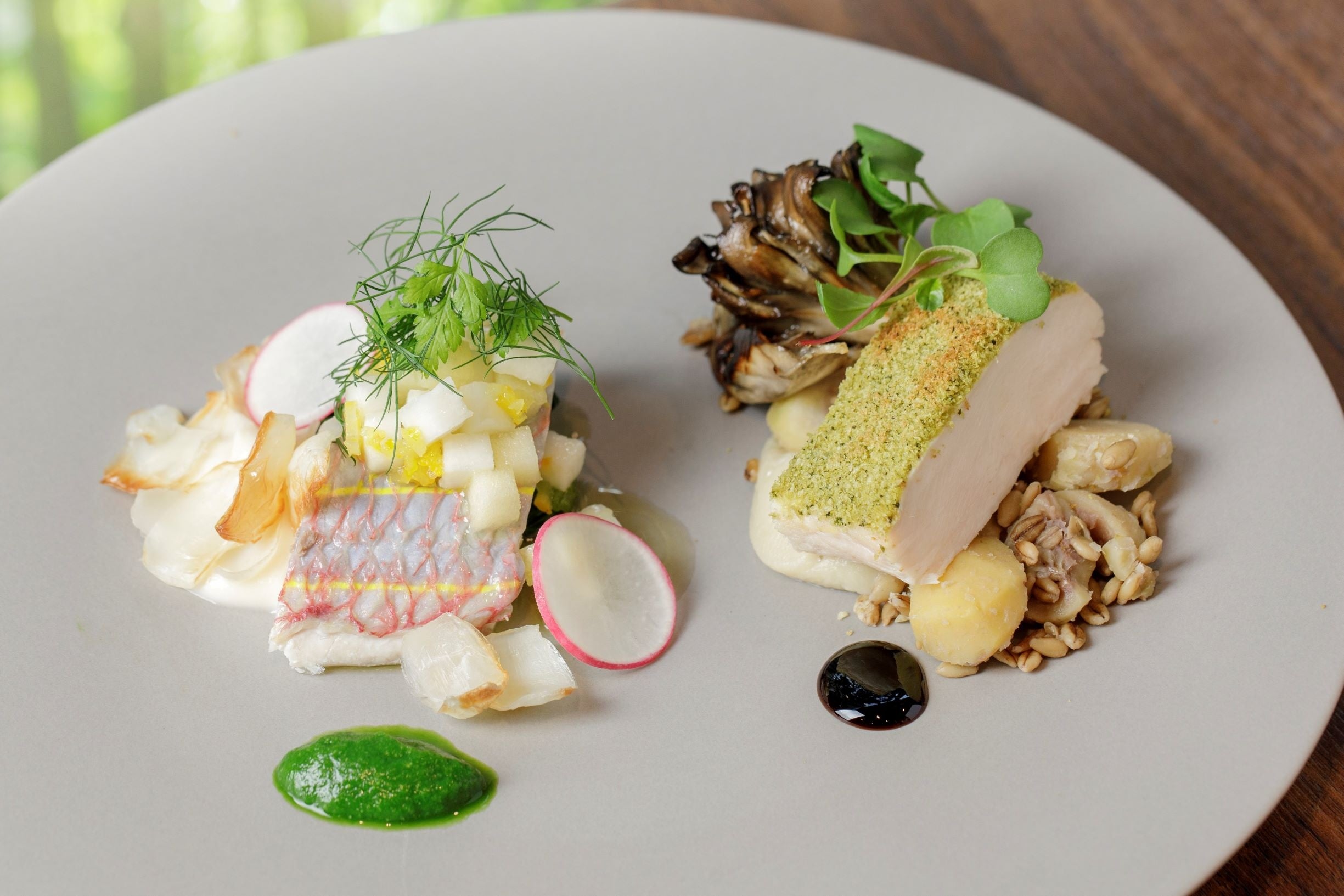 ウェルネス・ディナーコースでは、そのメニュー構成において、ウェルネスフード・コンシェルジュの大島がこだわる「ベジファースト」という考え方をベースに栄養バランスが考え尽くされています。また、当ホテルが得意とするウェルネスキュイジーヌへの期待とともに、ベジタリアン対応メニューも展開。料理長の北島は「グランバッハ銀座にいらしてくださるゲストには、心身ともに健康になっていただきたい」という気持ちでこれまでいくつかのホテルで料理に携わってきた経験を踏まえて、上質かつ美味しさを追求しています。