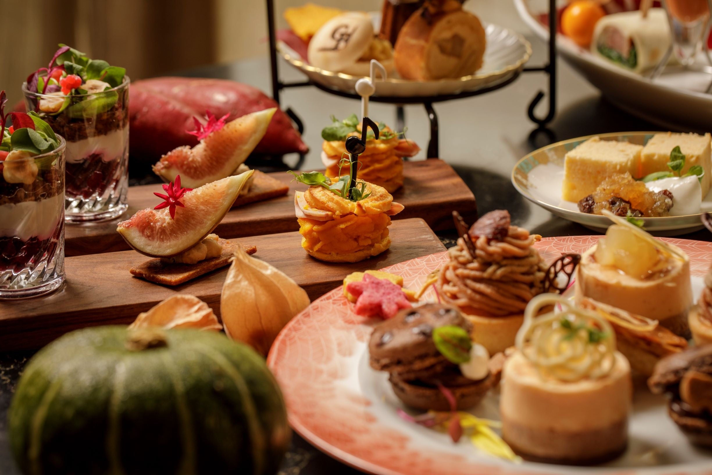料理長とウェルネスフード・コンシェルジュが提案するこの秋のアフタヌーンティーは、スーパーフードやヴィーガン食材が彩るウェルネスなオーバーチュア(序曲)として始まる第1楽章にセイボリーを。第2楽章では、さまざまな秋野菜が奏でる躍動感溢れる楽曲のように、いろいろなスイーツをお愉しみください。そしてシェフの技法が織りなす華やかなフィナーレへ。再びセイボリーをご堪能いただく第3楽章で締めくくる、銀座の秋を彩る贈り物として心身ともに満たされる時間をお届けします。