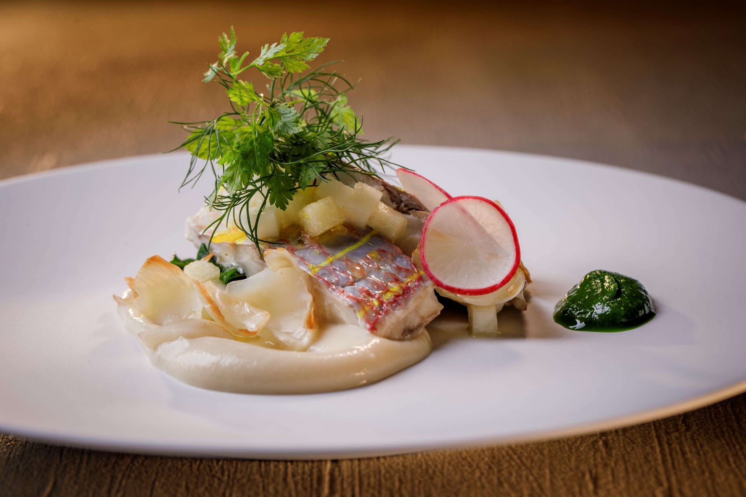 (写真)2023年秋のウェルネス・ディナーコース メイン料理(魚)「イトヨリのヴァプール 林檎と蕪のソース 柚子の香り」