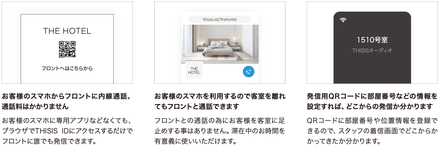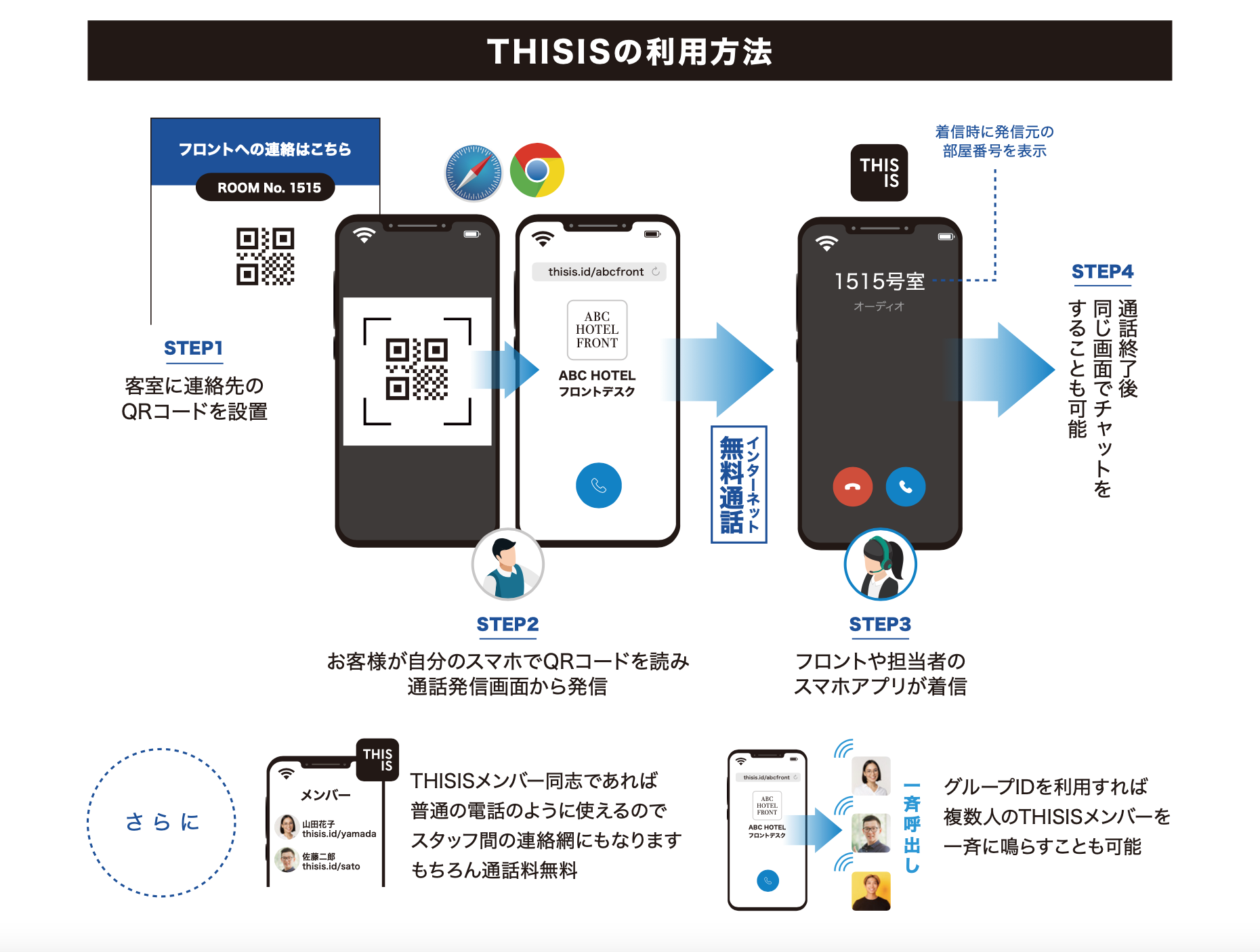 今回のホテル事業者向けのサービスでは、フロントのTHISIS IDを登録し、そのQRコードを客室に掲出するだけで、お客様のスマートフォンからフロントへの無料通話発信を可能にするものです。