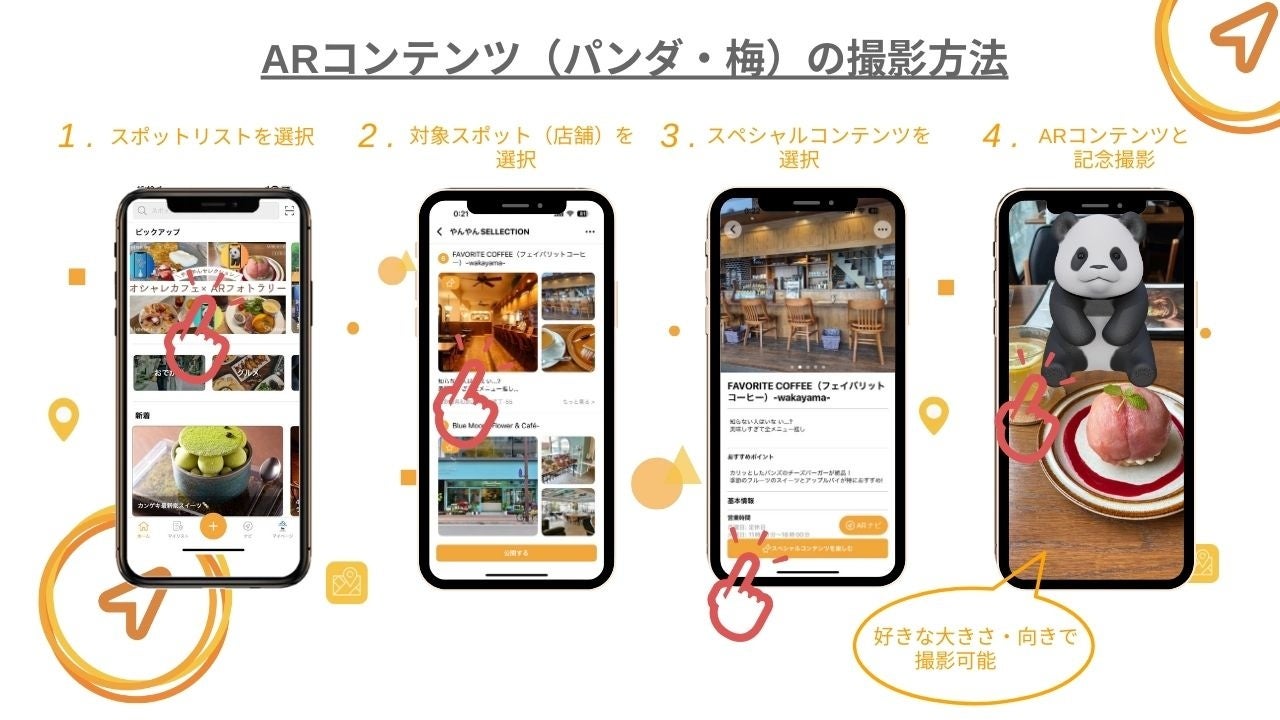 各店舗では、和歌山にゆかりのあるARコンテンツが各地限定で出現し、カメラ機能を活用して料理と一緒に記念撮影もできますので、ぜひたくさん訪れてください!