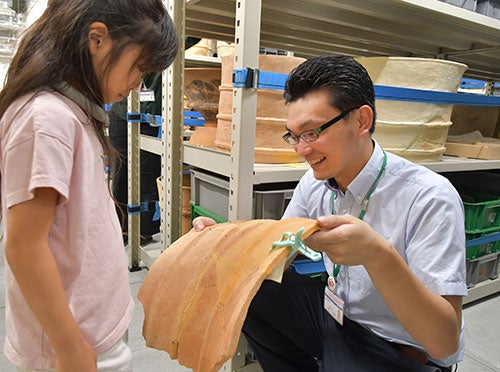 8月2日(水曜日)、高槻市立今城塚古代歴史館で夏休みの特別企画として、普段来館者が立ち入ることができない収蔵庫などの博物館の裏側を見学できる「夏休みバックヤードツアー」を開催し、参加者11人が学芸員の案内のもと収蔵庫や出土品整理作業を見学するなど貴重な体験をしました。