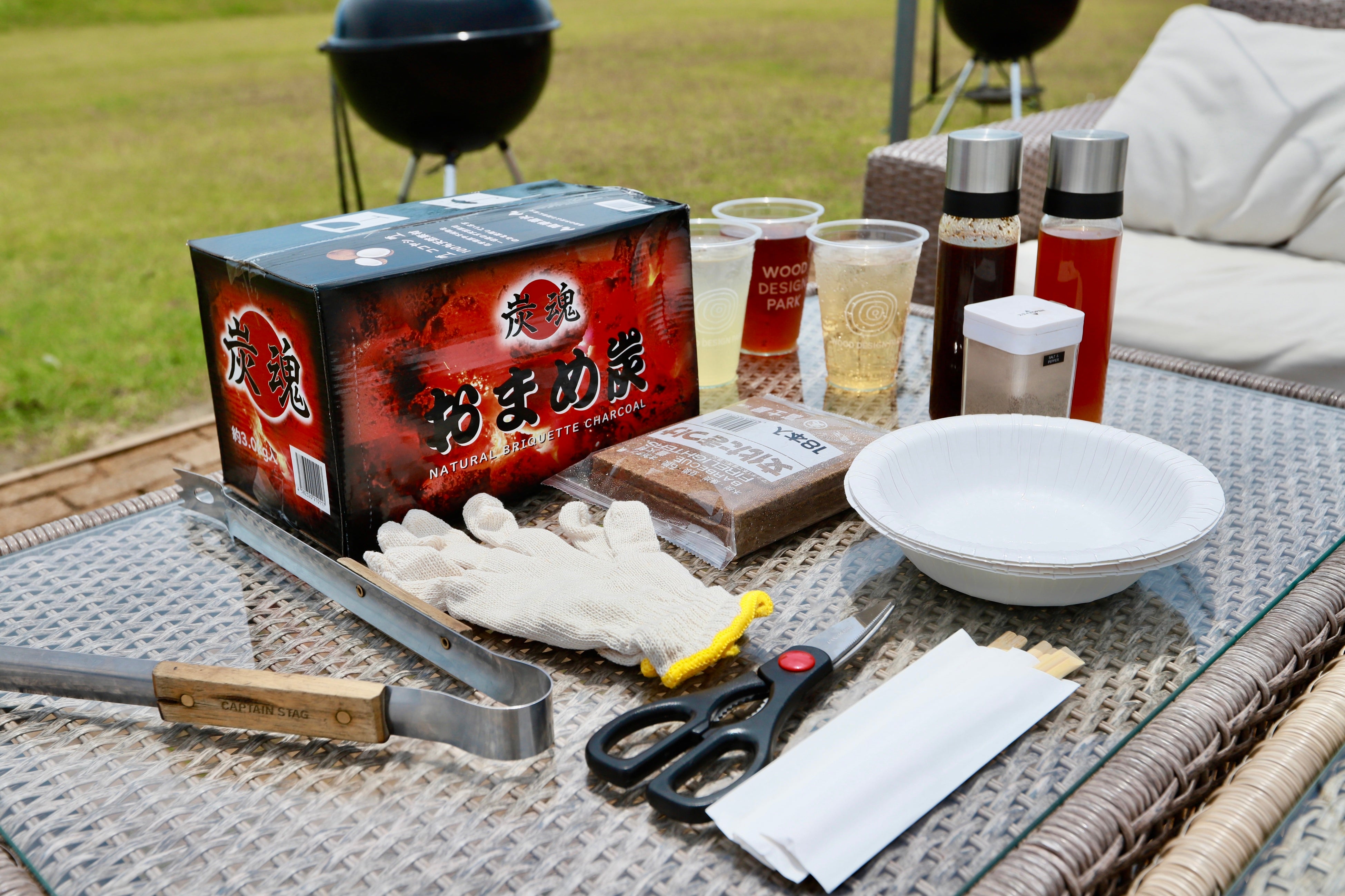 ●BBQセット(炭、炭用トング、着火剤、軍手、皿、箸、ハサミ、トング、塩胡椒、BBQソース)