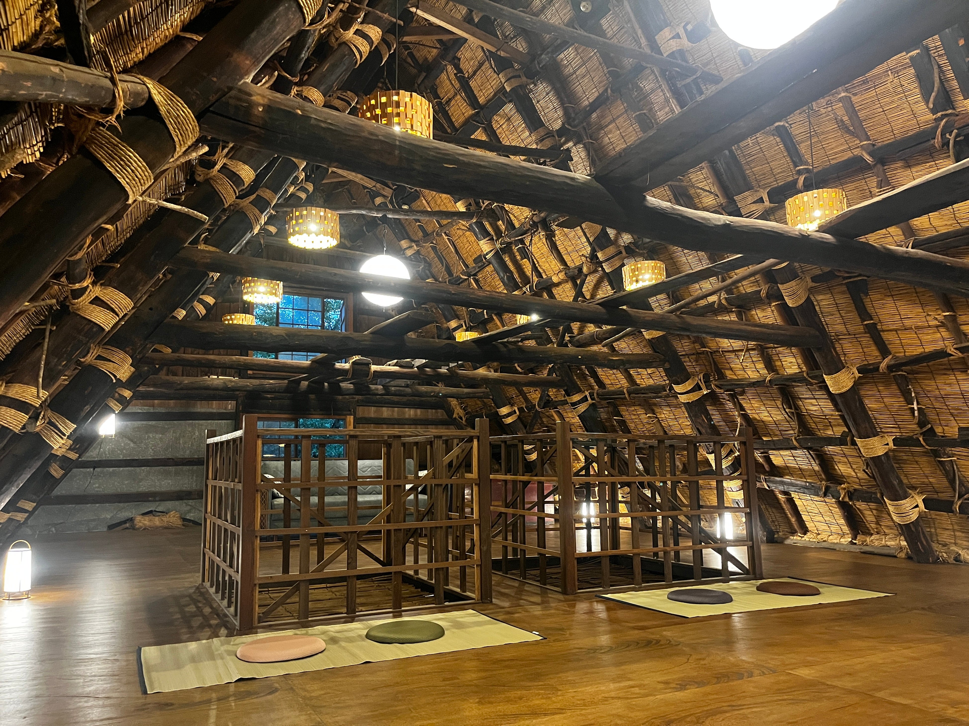 茅葺でできた屋根、室内にある大きな囲炉裏、休息したくなる縁側、すべてが日本の古き良き日常文化を表現し、どこか懐かしい雰囲気が感じることができる建物です。