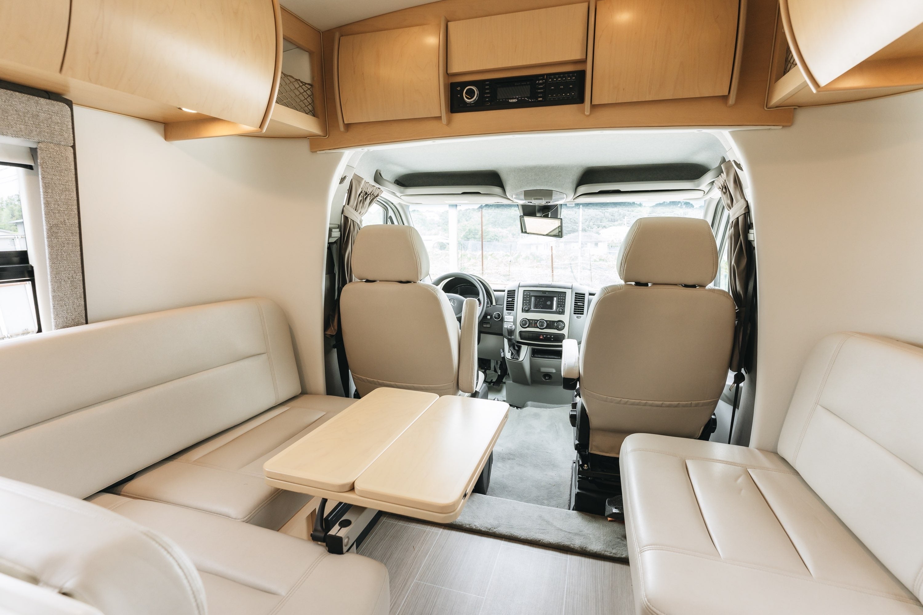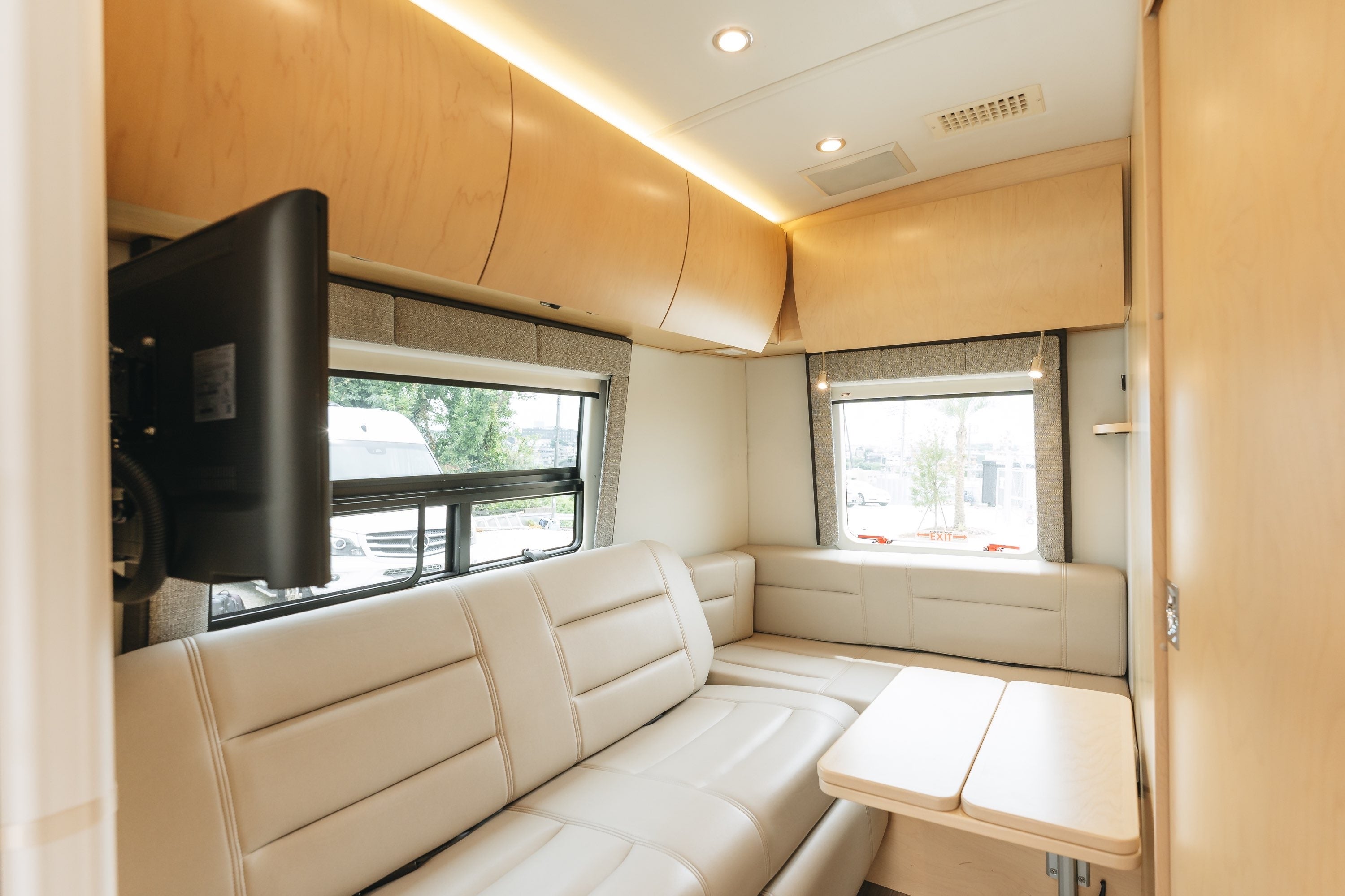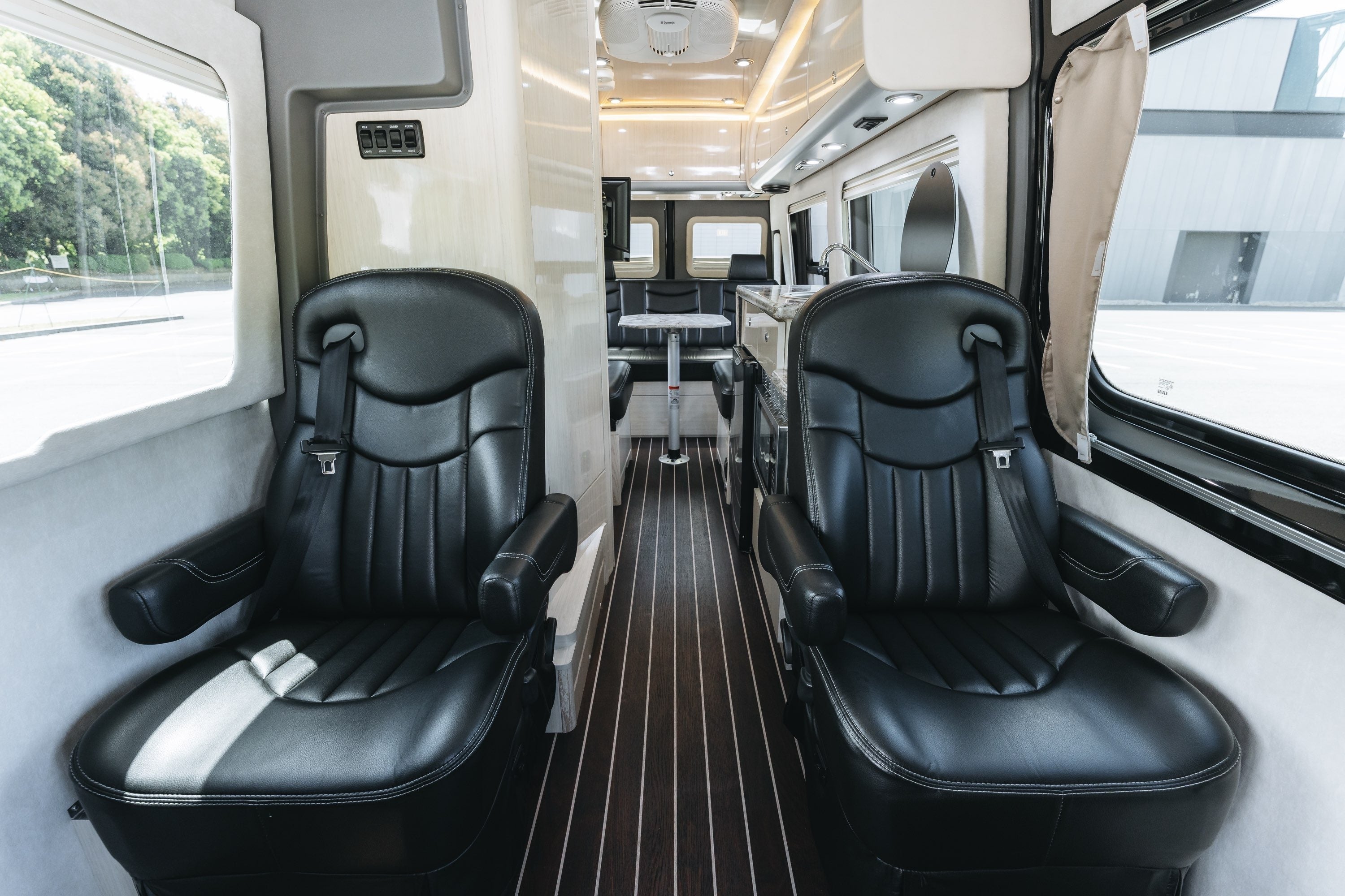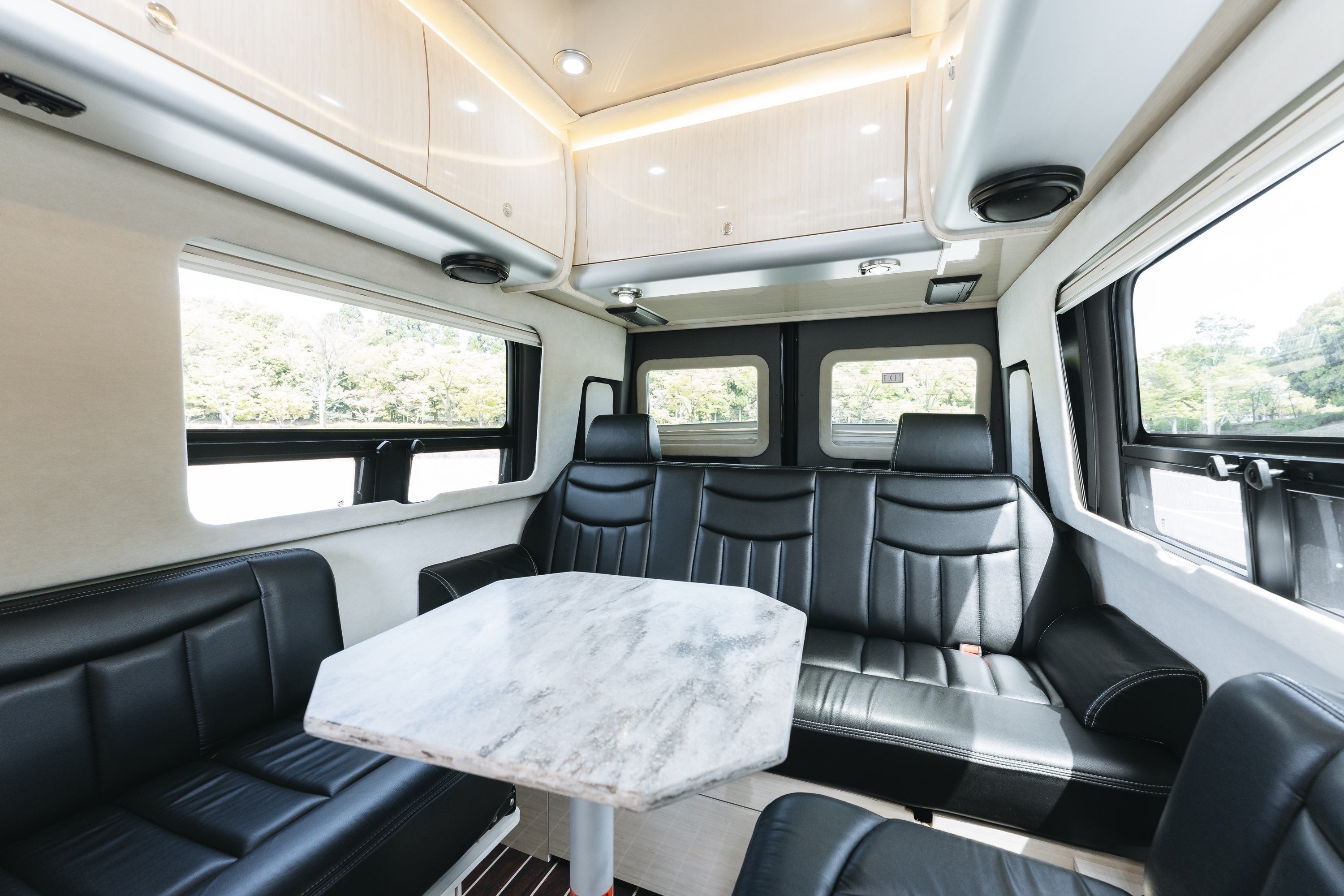 最高級ラウンジカーの「INTERSTATE」は、米国の老舗トラベルトレーラーメーカーであるエアストリームが内装を手がけた車種。メルセデスベンツの滑らかでパワフルな走行と剛性の高いシャーシによって移動時の静粛性を保ちながら、車内で快適に過ごせる。くるま旅・お客様の送迎にも幅広く使用できます。