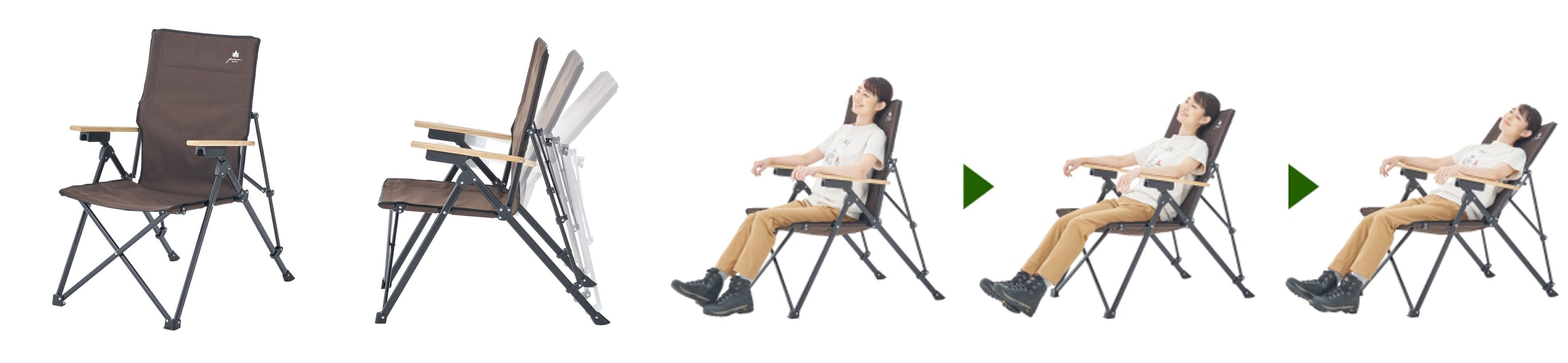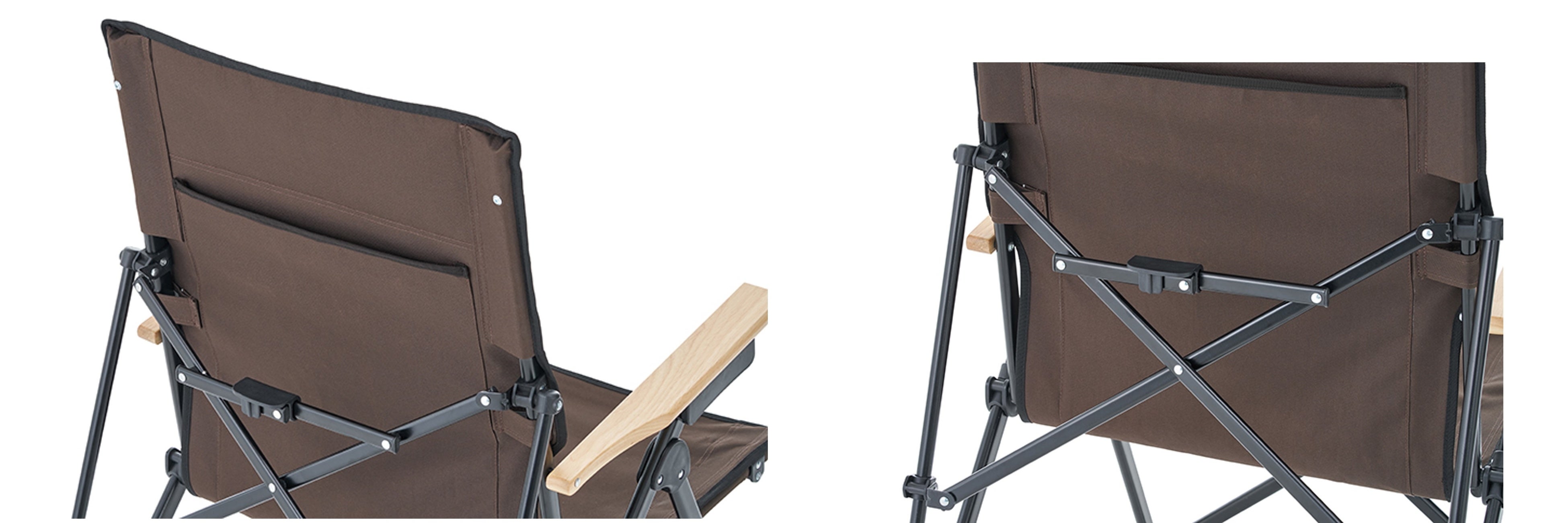本アイテムは、3段階のリクライニング機能に加え、頭まで支えることのできる安定感のあるハイバック仕様の背もたれで、長時間座っても疲れにくくゆったりとくつろげるチェアです。リクライニングの調節は両方のアームレストを持ち上げるだけなので、座ったまま簡単に調節できます。腰掛ける際や立ち上がる時に便利なアームレストは木製で、アウトドアシーンでの使用はもちろん室内にも馴染むデザインです。