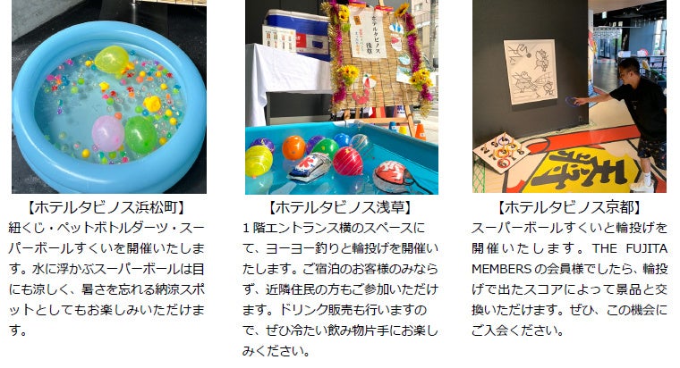 藤田観光グループのWHGホテルタビノス株式会社(本社:東京 総支配人:阿良友香理)が運営するホテルタビノス浜松町・浅草・京都の各館では、ご宿泊のお客様へ向け、“日本の夏”を感じられるイベントを開催いたします。感染症の影響も徐々に収束し、国内外から多くのお客様にご宿泊いただいており、今年の夏はお客様に気軽に“日本の夏”を感じられるよう、8月限定の特別イベントをご用意いたしました。