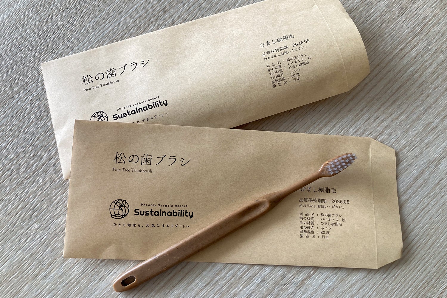 この宿泊プランは、シーガイアのリゾートエリアに広がる黒松林の保護・育成を目的とした「黒松林の植樹プログラム」(1部屋あたり1苗)、ホテル内のレストランで提供しているパイナップルから、本来廃棄される“へた”の部分を利用し、3年後の収穫を目指して育成を行う「パイナップル再生プログラム」(9月・10月限定)のいずれかの体験プログラムを受けられるほか、客室にはリゾート内の廃棄松を使用した樹脂製の「松の歯ブラシ」をはじめ、「植えると芽が出る鉛筆」やシーガイアのサステナビリティロゴマークをあしらった「エコバッグ」などエコを意識しながらも、使って楽しいアイテムをご用意。また環境に配慮した移動手段として、レンタサイクルを1日乗り放題(いずれか1日)で利用いただけます。