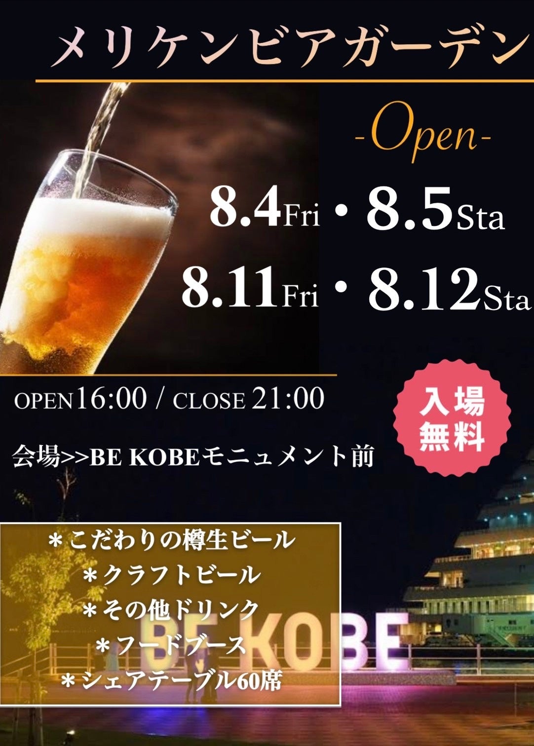 今年の夏、メリケンパークの夏の賑わいづくりとナイトタイムエコノミーの推進を目的として、神戸のメリケンパークで週末限定の特別なイベントを開催します。このイベントでは有名なクラフトビールが樽変わりで登場するほか、それらを引き立てる数々のフードメニューをご堪能いただけます。美しい夕暮れに合わせた素敵な音楽と共に、海風を感じながら上質な時間をお過ごしください。