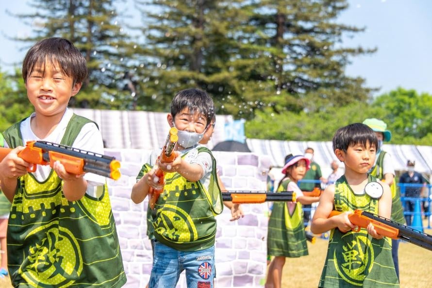 本イベントは火縄銃型の水鉄砲を用いて2軍に分かれて撃ち合う、びしょ濡れ必至の戦国風水合戦イベントです。胸に付いたワッペンを狙うと”落ち武者マーク”が出現、マークが出ると”討ち死”となります。甲冑ビブスを着用し、ときにはフィールド上にある矢盾に身を隠しながら相手を迎え撃ちます。老若男女問わずお楽しみいただけます。