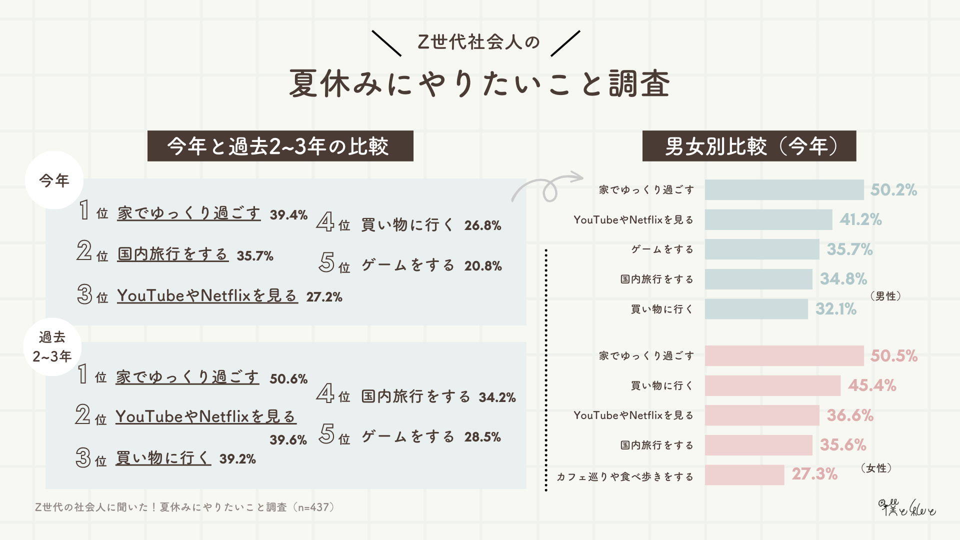 「夏休みにやりたいこと」に関する調査では、男女ともに「家でゆっくり過ごす」がトップに。「YouTubeやNetflixを見る」も同等と考えた場合、およそ6割のZ世代が「夏休みは家でゆっくり過ごしたい」と考えているという結果になりました。
