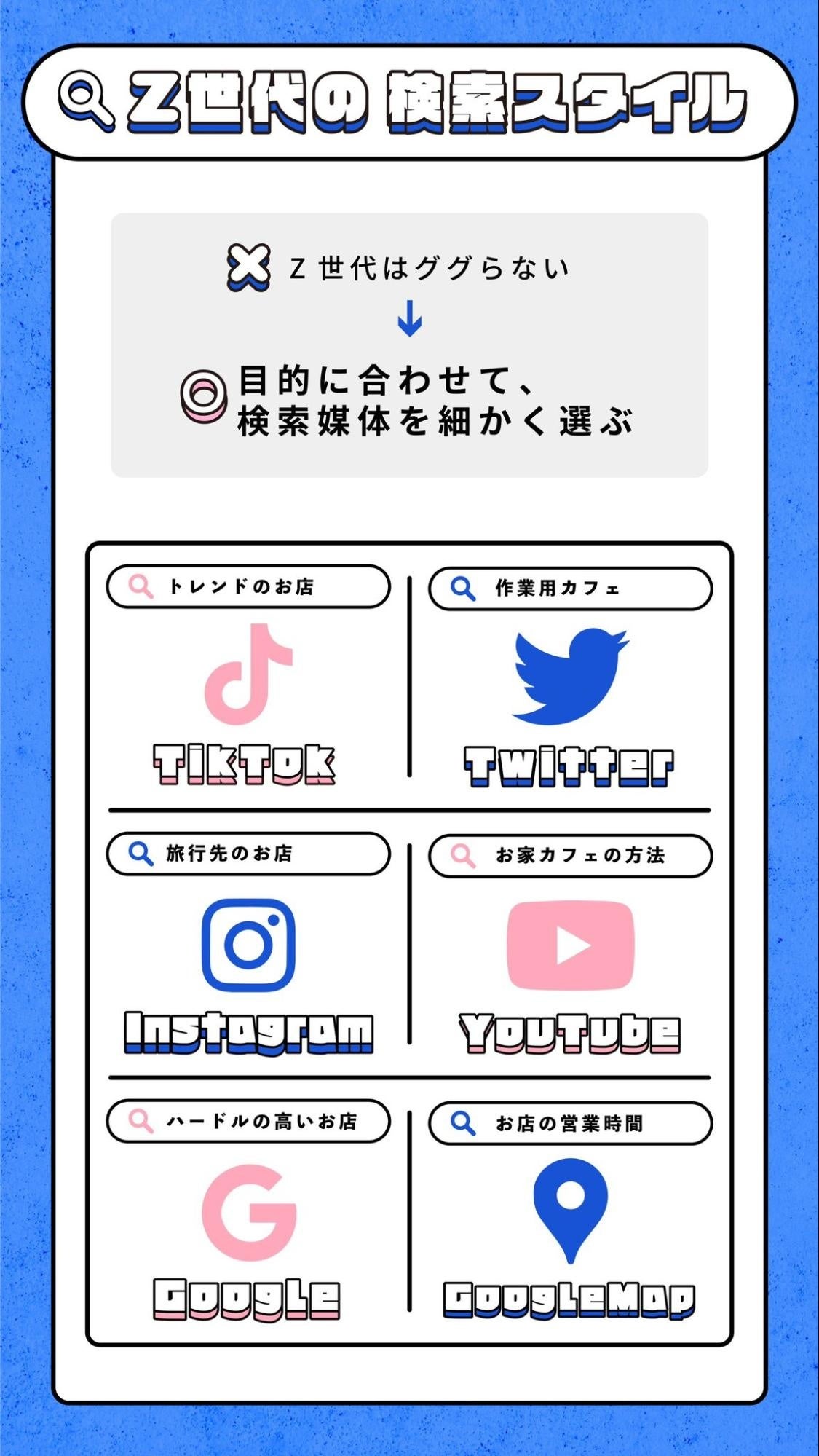 また、情報収集源については、もともとZ世代が種類を問わず、プラットフォームの「使い分け」が得意な世代だというのもポイントです。目的に合わせて、検索媒体を細かく選ぶことが当たり前で、例えば、私の場合はニュースはGoogle、飲食店はTikTok、旅行先はInstagram、コスメはTwitterで探しています。