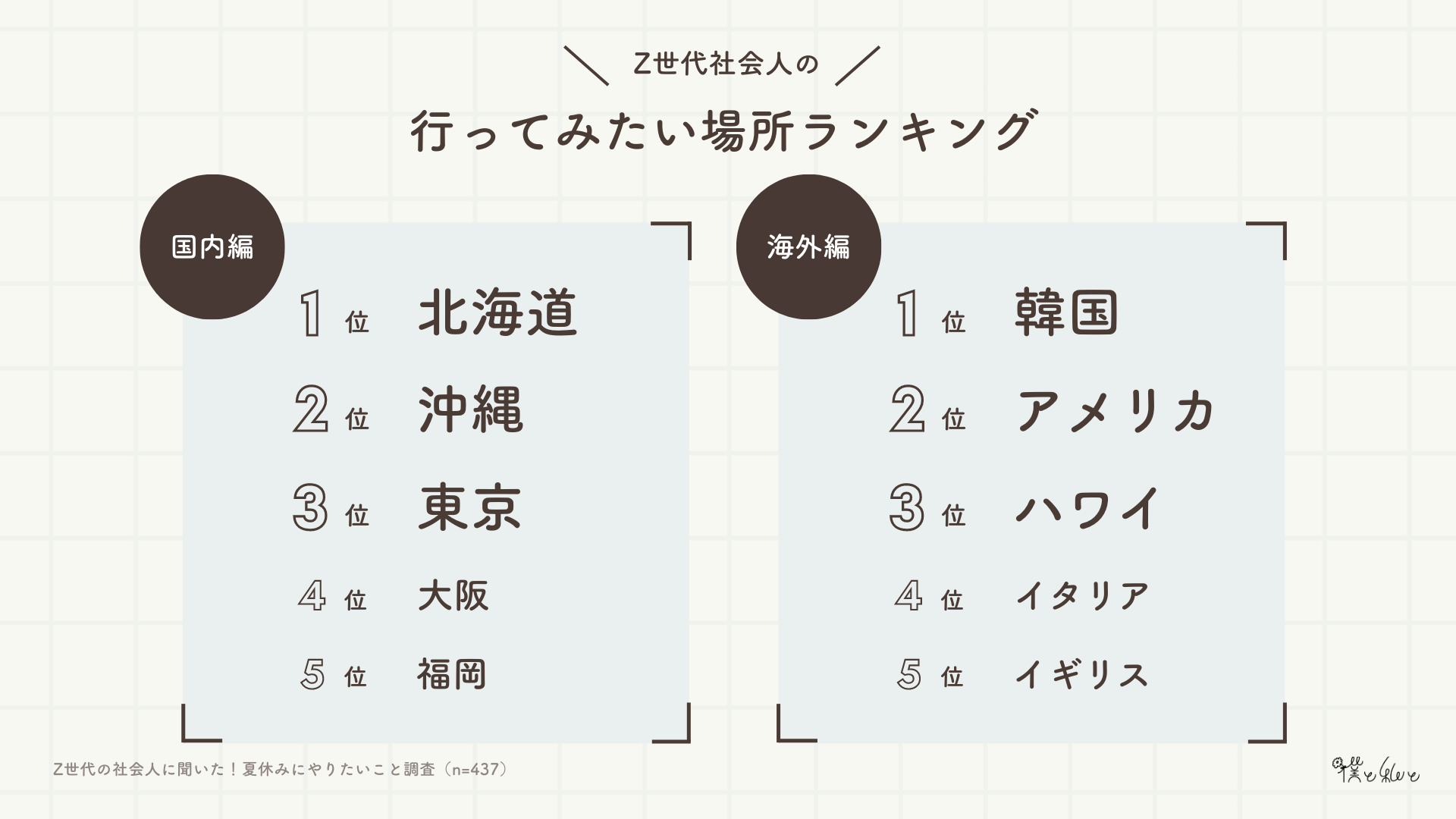 続いて、「夏休みに行ってみたい場所」は、国内では「北海道」、「沖縄」、「東京」など、世代を問わずに人気の観光地が並びましたが、海外では「韓国」がトップに躍り出るなど、トレンドに敏感なZ世代ならではの特徴も。