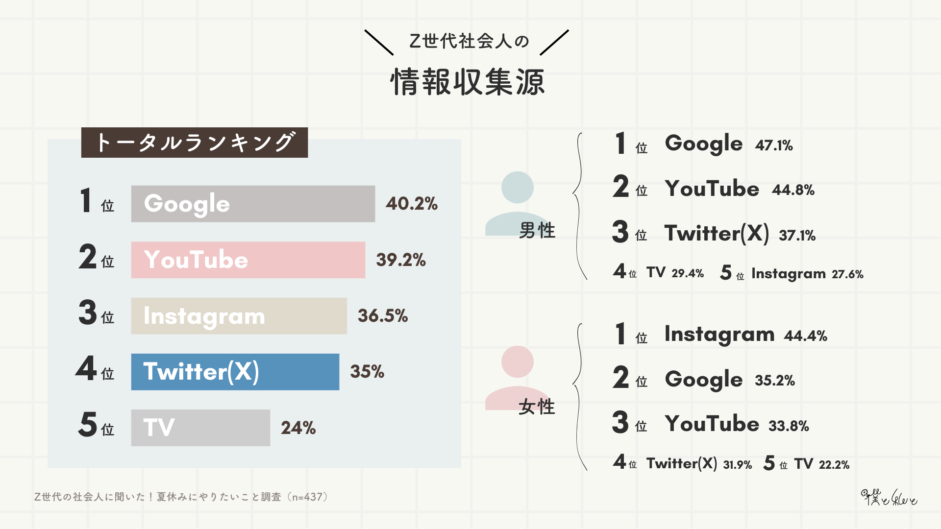 最後に、「Z世代の情報収集源」に関する調査では、1位に輝いたのは「Google」と「YouTube」、次点で「Twitter」「Instagram」と、やや意外な結果に。