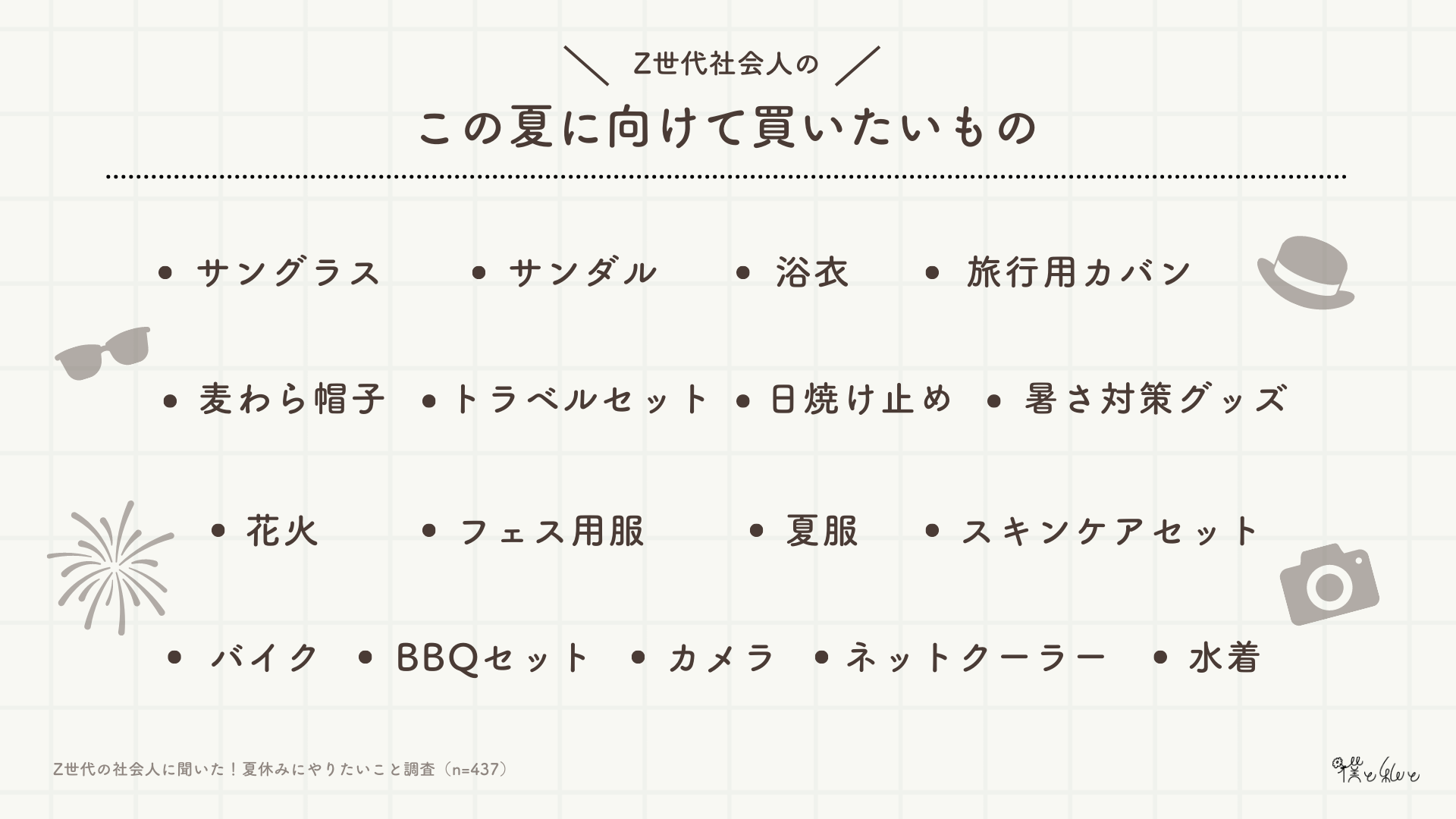 「この夏に向けて買いたいもの」に関する調査では、「サングラス」や「サンダル」、「浴衣」や「旅行用カバン」など、アウトドアアイテムが多く見られ、ここでもアクティブな夏休みを過ごしたい人が多いことが伺えます。
