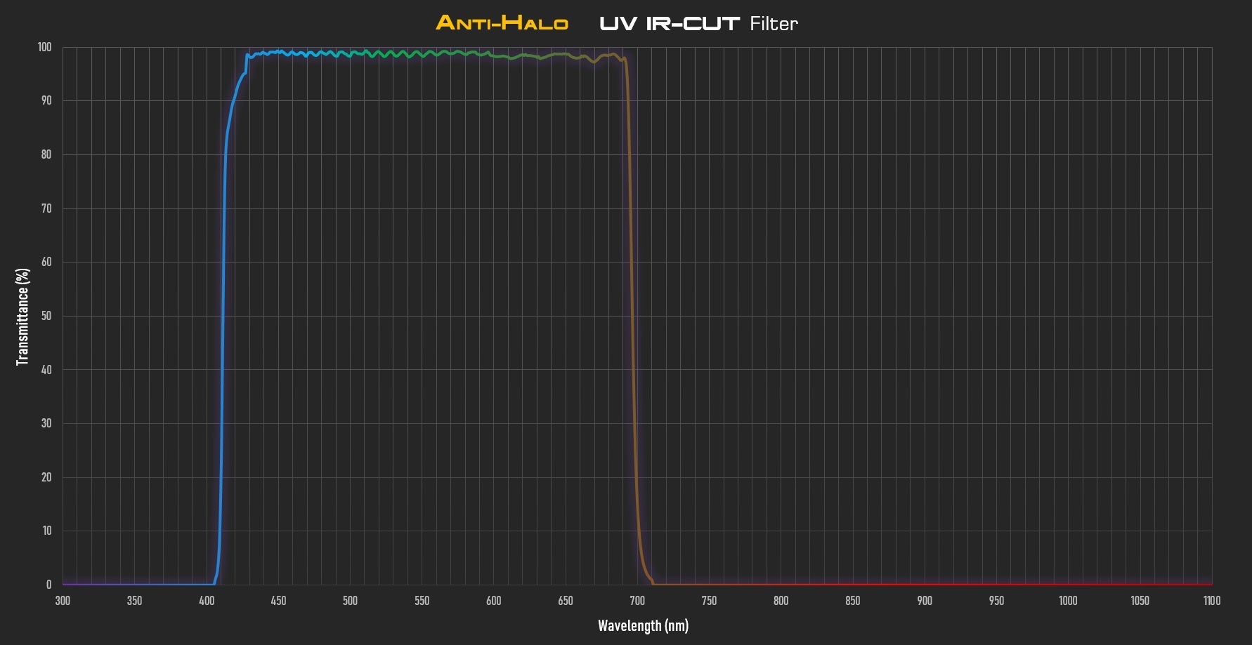 紫外線(200nm~)と赤外線(~1100nm)をカットする設計のため、UV/IRカットフィルターとの併用は不要です。輝線以外のカットされる波長の光の透過率は0.00001%(10万分の1)以下です。
