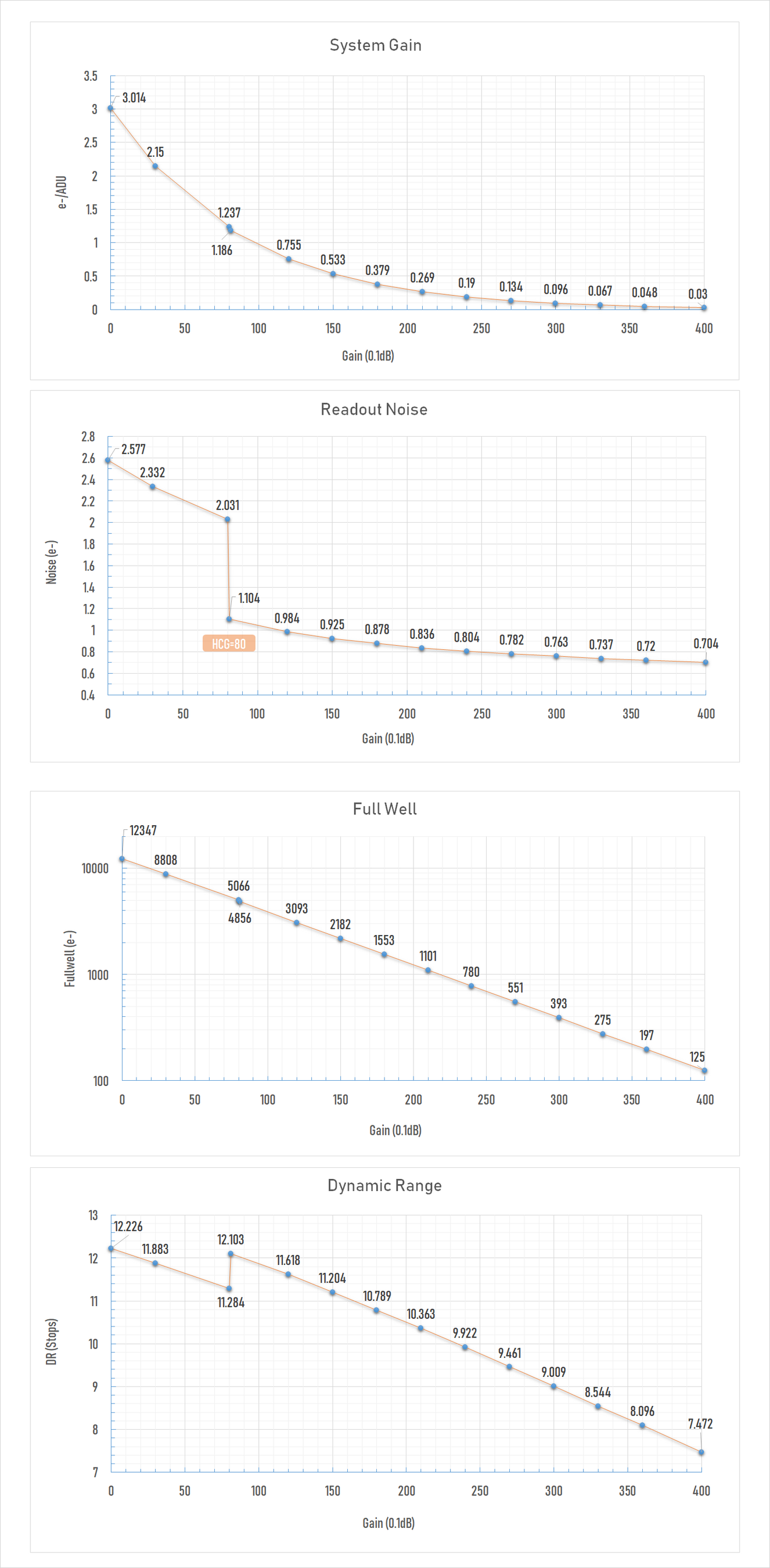 Mars-MIIはゲイン80以上になると自動的にHCGモードがオンになり、読み出しノイズを大幅に減らし、ダイナミックレンジを拡張します。