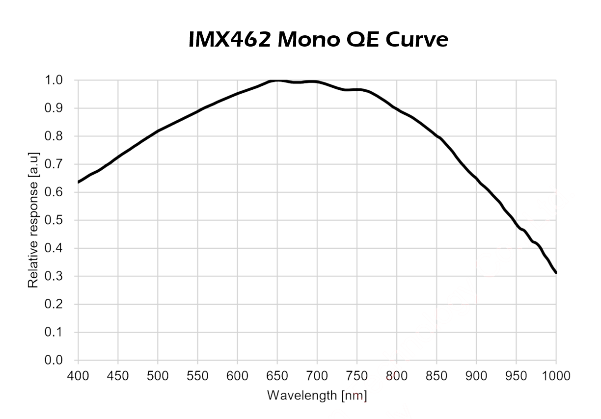 IMX462は極めて高い赤外線感度を持ち、高解像度、低読み出しノイズが特長のセンサーです。最大91%の量子変換効率と、高い赤外線感度によって、IRパスフィルターを用いた月面や惑星の近赤外線撮影に特に適しています。