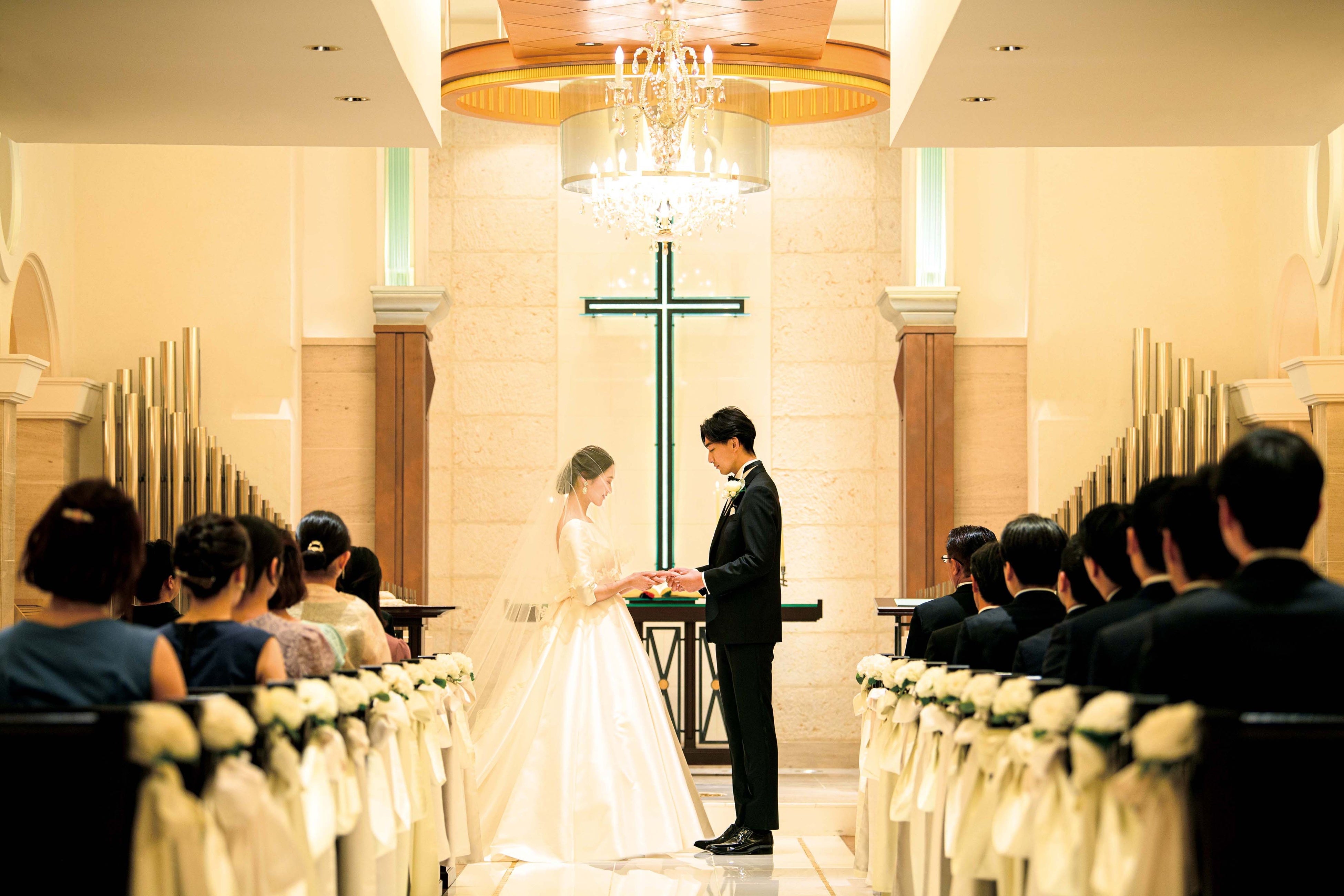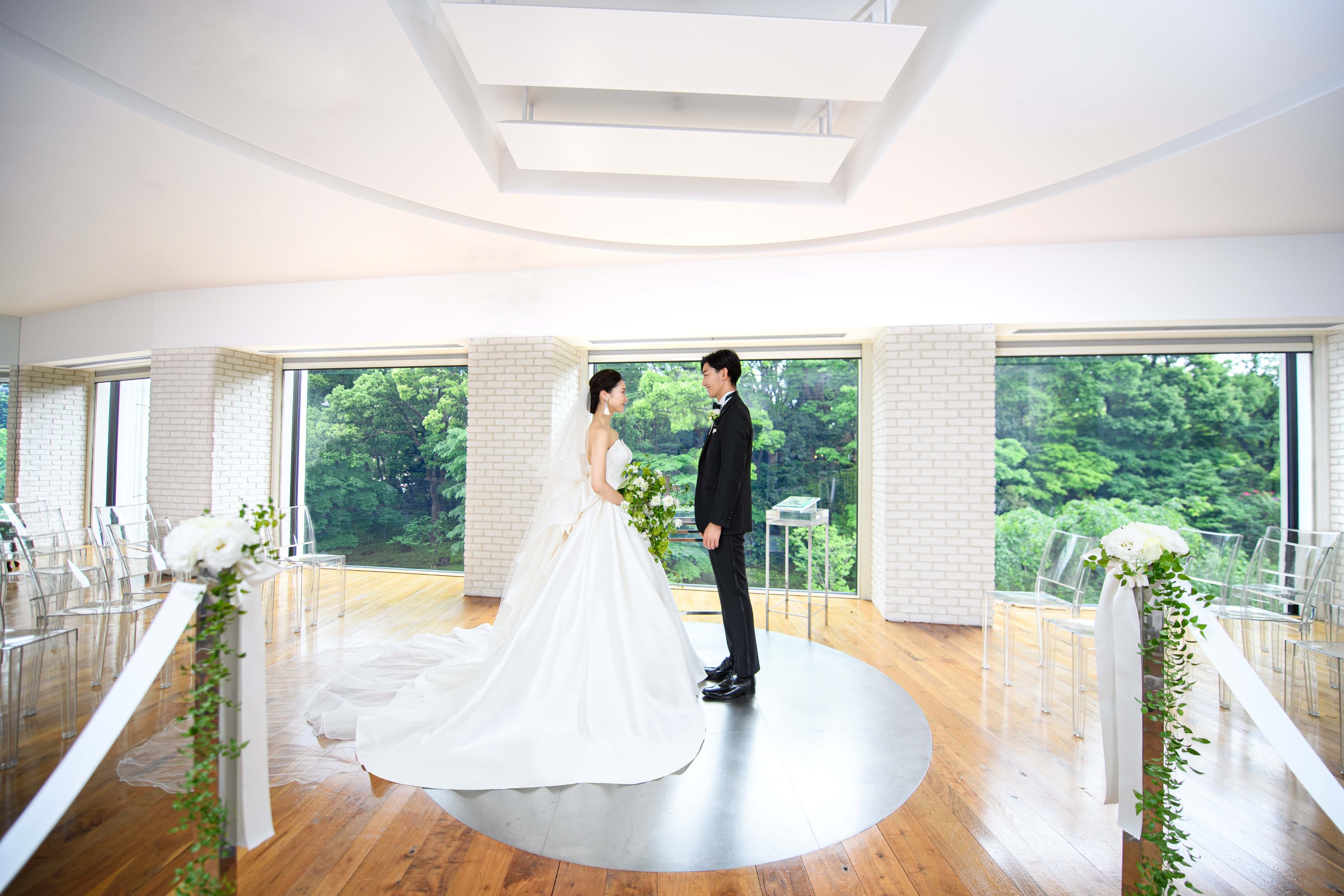 目の前に緑豊かな日本庭園が広がり、 一面の窓から陽光がたっぷりと差し込むチャペル。 アットホームな雰囲気をご希望のおふたりにぴったりの挙式会場です。
