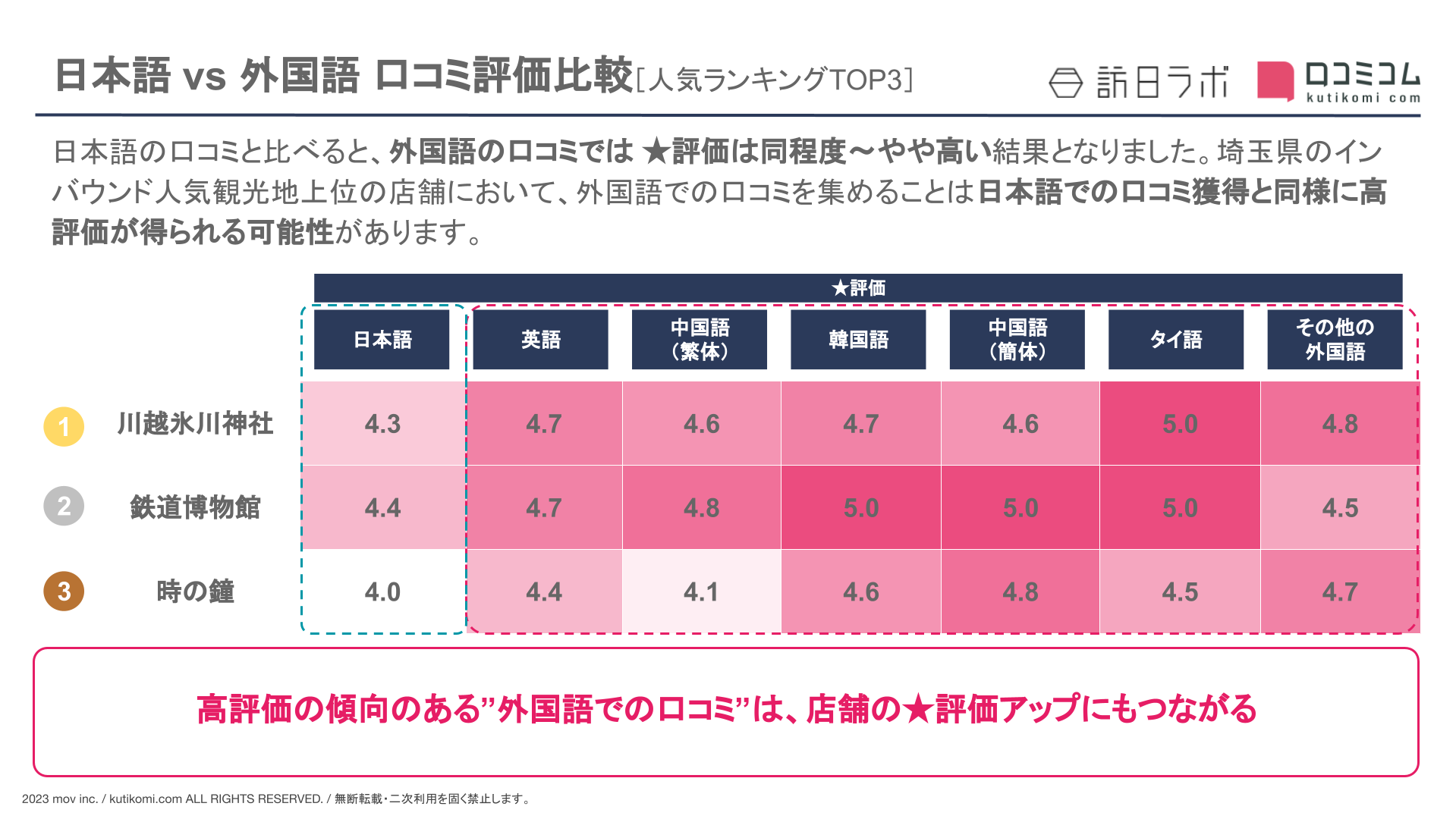 日本語の口コミと比べると、外国語の口コミでは ★評価は同程度〜やや高い結果となりました。埼玉県のインバウンド人気観光地上位の店舗において、外国語での口コミを集めることは日本語での口コミ獲得と同様に高評価が得られる可能性があります。
