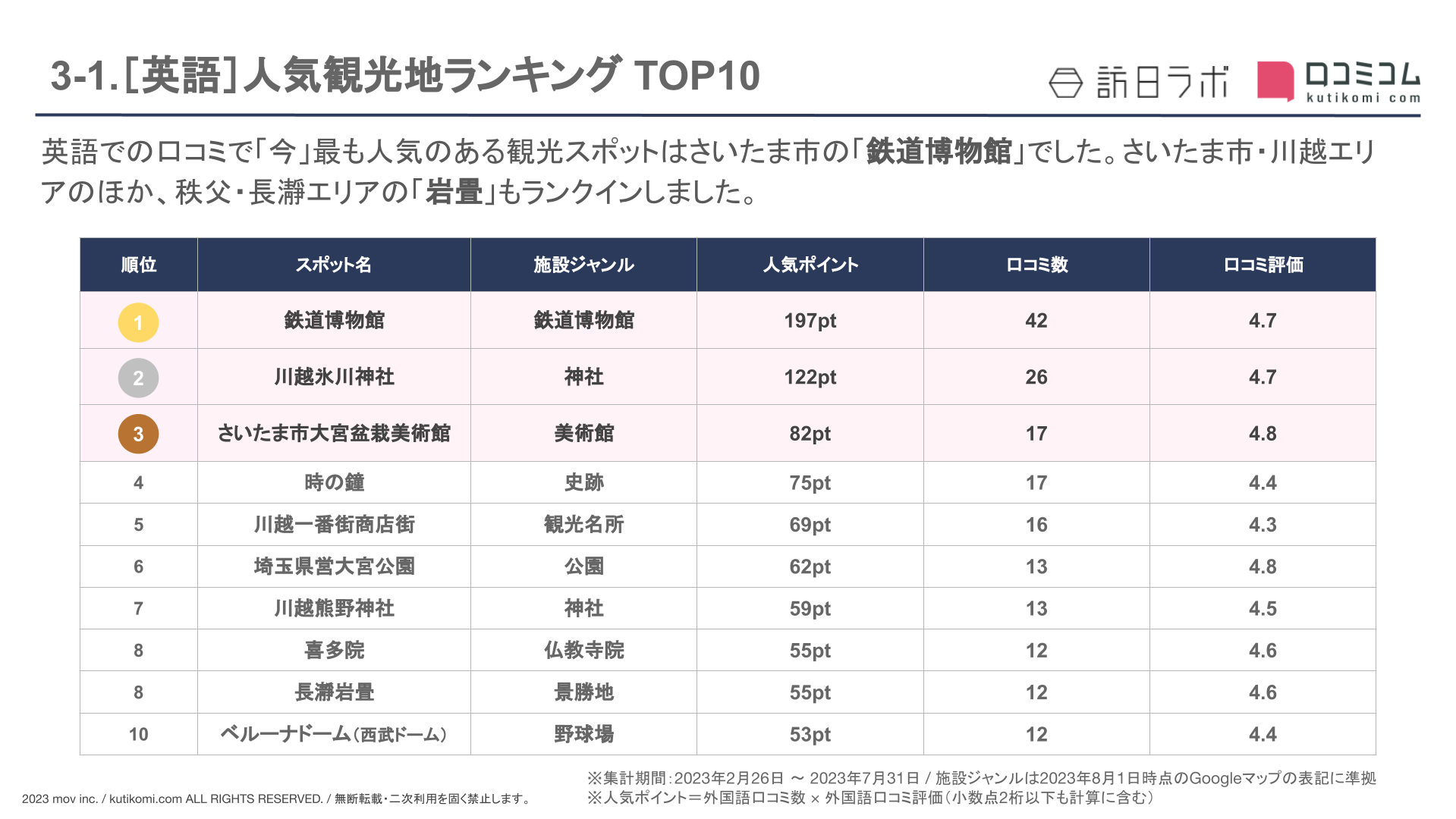 英語での口コミで「今」最も人気のある観光スポットは「鉄道博物館」でした。さいたま市・川越エリアのほか、秩父・長瀞エリアの「岩畳」もランクインしました。