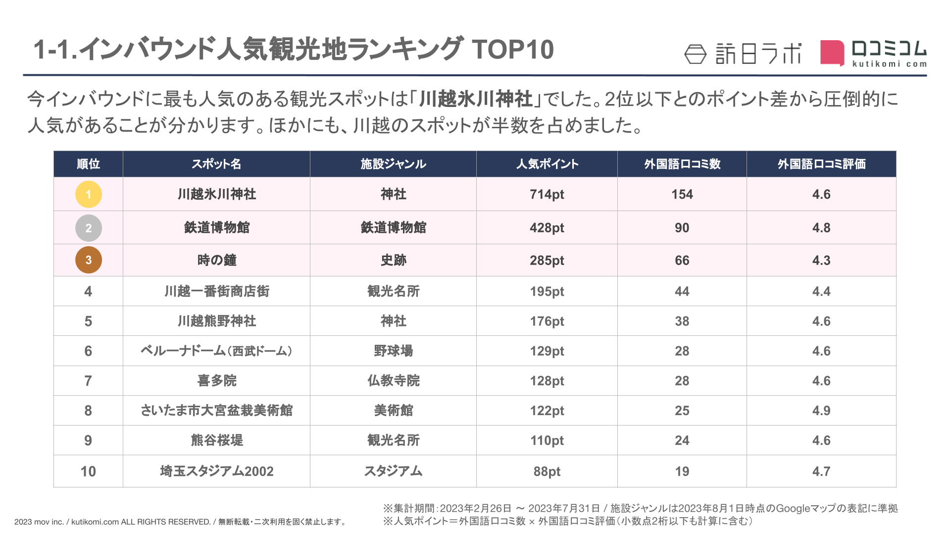 数ある観光地のなか、埼玉県で今インバウンドに最も人気がある観光スポットは「川越氷川神社」でした。2位以下とのポイント差から圧倒的に人気があることが分かります。ほかにも、川越のスポットが半数を占めました。
